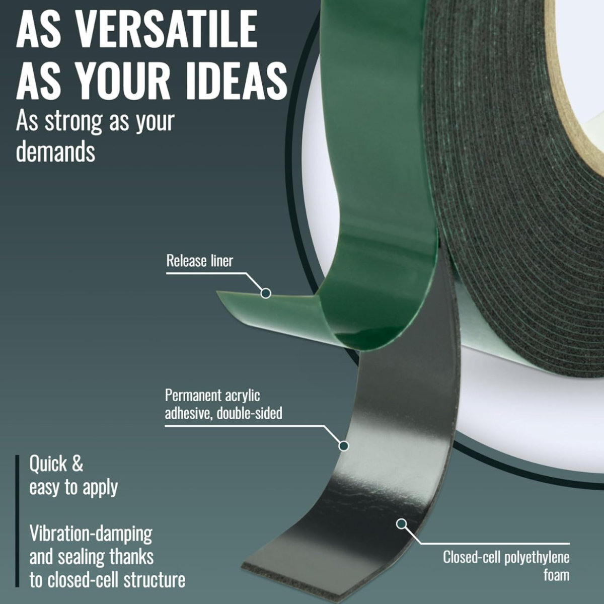 | Constructii si amenajari fatade | Fixeaza panouri de fatada, placi decorative late, profile de aluminiu, rigle de iluminat arhitectural, elemente de design exterior. Latimea de 25mm asigura o fixare sigura pe toata lungimea. |