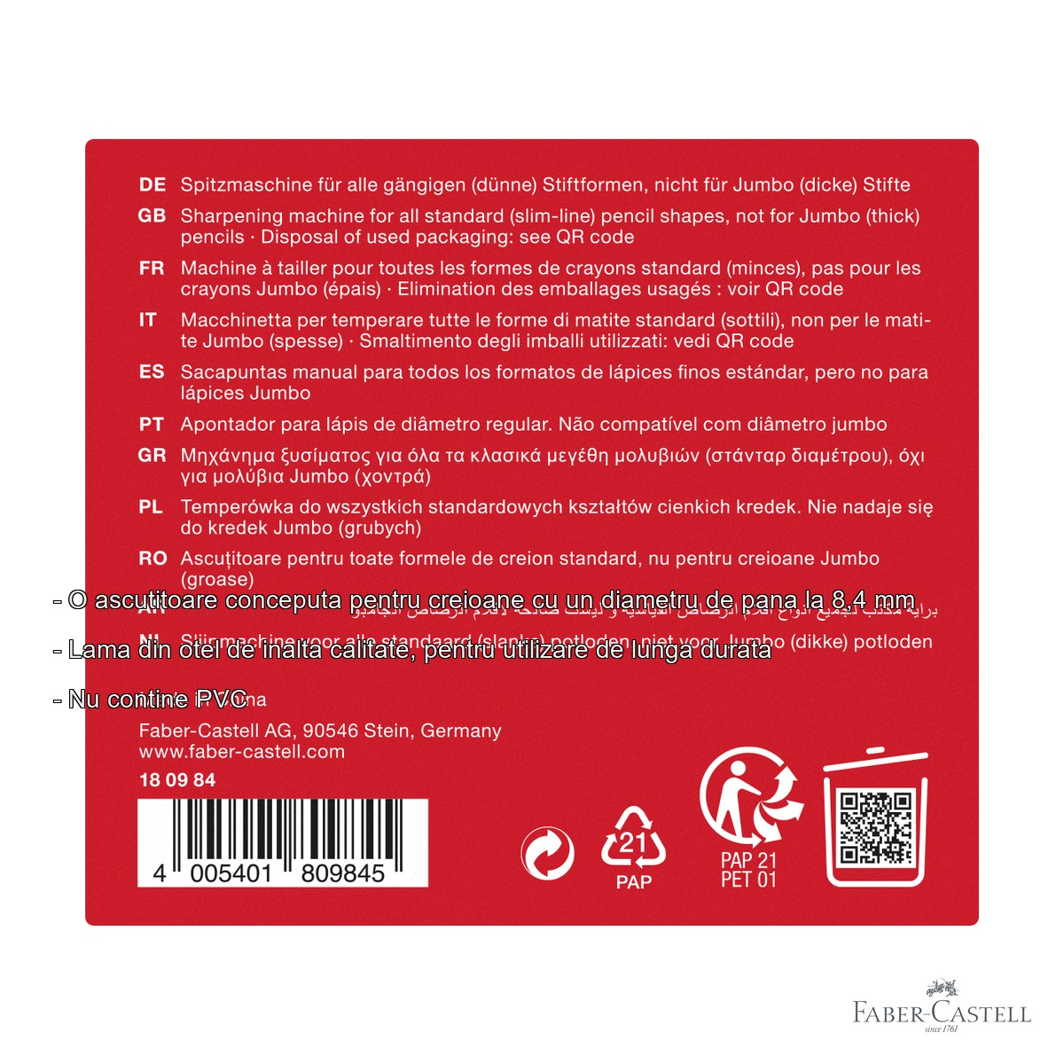 Alegand ascutitoarea fixa Faber-Castell, beneficiezi de o serie de avantaje clare fata de produsele de calitate inferioara. In primul rand, lama din otel de inalta calitate garanteaza o ascutire uniforma si precisa, fara a rupe mina creionului. Aceasta lama este conceputa pentru utilizare de lunga durata, ceea ce inseamna ca nu va trebui sa inlocuiesti frecvent ascutitoarea. In al doilea rand, containerul integrat pentru reziduuri mentine curatenia biroului sau a bancii, eliminand necesitatea unui cos de gunoi in apropiere in timpul ascutirii. Un alt avantaj important este faptul ca produsul nu contine PVC, ceea ce il face o alegere mai sigura si mai responsabila din punct de vedere al materialelor folosite. Design-ul negru, elegant si discret, se integreaza perfect in orice spatiu de lucru, de la biroul clasic la atelierul creativ. Compatibilitatea cu creioane de pana la 8,4 mm in diametru ii confera versatilitate, acoperind o gama larga de creioane grafite, colorate sau speciale.