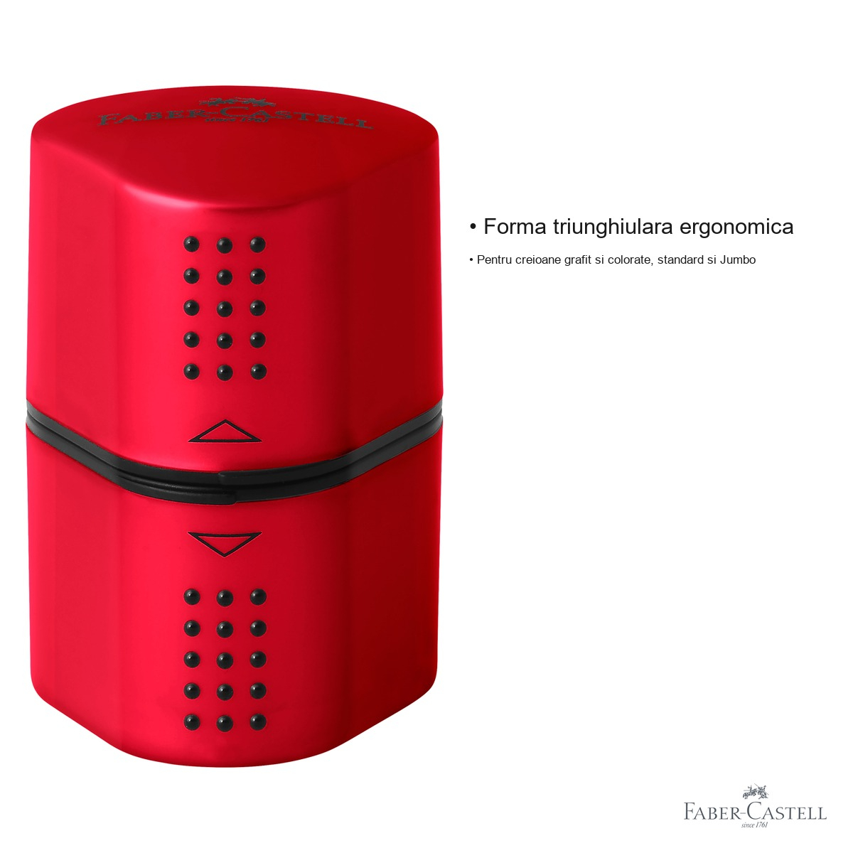 Indiferent ca esti elev, student, artist sau pasionat de desen, un instrument de ascutit de calitate face diferenta intre un varf perfect si unul franjurat. Ascutitoarea tripla Faber-Castell Grip 2001 a fost conceputa pentru a raspunde nevoilor diverse ale utilizatorilor care lucreaza cu mai multe tipuri de creioane. Cu un design ergonomic triunghiular, aceasta ascutitoare se potriveste natural in mana, reducand efortul si oferind un control precis in timpul ascutitului. Containerul integrat pe ambele parti asigura colectarea comoda a reziduurilor, pastrand masa de lucru curata si ordonata.
