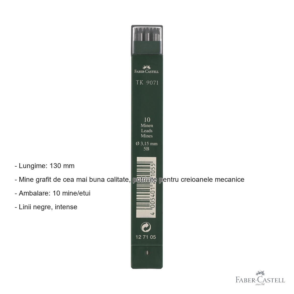 Minele grafit Faber-Castell cu duritate 5B sunt recunoscute pentru moaletea lor superioara, care permite trasarea unor linii negre, dense si expresive. Grafit-ul de inalta calitate utilizat in fabricatie asigura o textura uniforma a liniei, fara striatii sau intreruperi neplacute. Un avantaj major al acestor mine este usurinta cu care pot fi sterse, permitand corectii rapide si curate fara a deteriora suprafata hartiei. Lungimea de 130 mm ofera un timp de utilizare prelungit, reducand frecventa inlocuirii minei. Etuiul inclus in ambalaj protejeaza minele impotriva socurilor mecanice si le mentine integre pana la momentul utilizarii. Compatibilitatea cu mai multe modele de creioane mecanice TK (4600, 9400 si 9500) face din acest set o optiune versatila si economica.