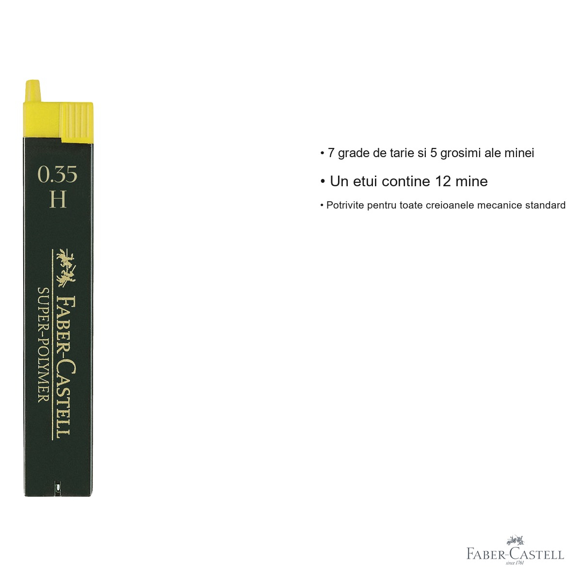 Atunci cand lucrezi cu un creion mecanic, calitatea minei face toata diferenta. O mina care se rupe frecvent intrerupe fluxul de lucru, lasa urme neuniforme si consuma timp pretios. Minele Faber-Castell Super-Polymer au fost concepute tocmai pentru a elimina aceste inconveniente. Cu o rezistenta deosebita la rupere si o grosime de 0.35 mm, aceste mine sunt ideale pentru trasarea de linii fine, precise si intense, fie ca lucrezi la schite tehnice, notite detaliate sau proiecte care necesita un scris ingrijit si ordonat. Faber-Castell este un brand cu traditie indelungata in domeniul instrumentelor de scris si de desenat, iar gama Super-Polymer reprezinta unul dintre cele mai apreciate produse din portofoliul sau, tocmai datorita performantei constante si calitatii materialelor utilizate.