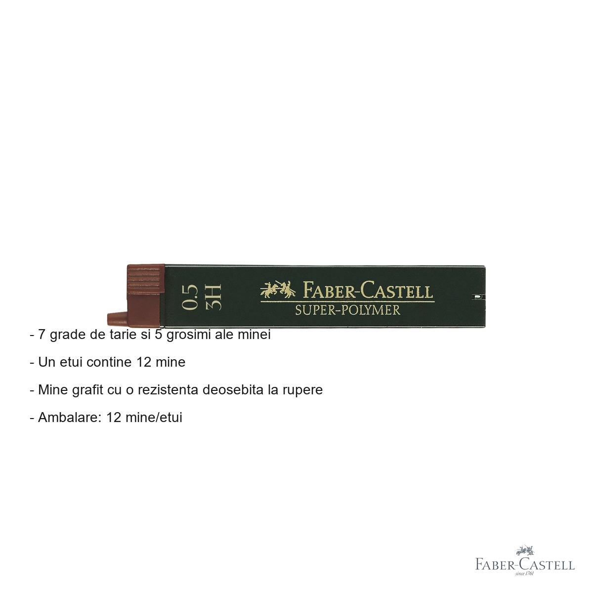 Formula Super-Polymer dezvoltata de Faber-Castell este rezultatul unor decenii de experienta in productia de instrumente de scris de inalta calitate. Principalul avantaj al acestor mine este rezistenta deosebita la rupere, ceea ce inseamna mai putine intreruperi in timpul scrierii sau desenului si mai putine mine risipite. Comparativ cu minele obisnuite, formula Super-Polymer asigura o durabilitate superioara, reducand astfel costurile pe termen lung.