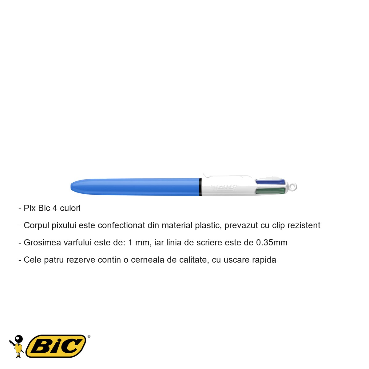 Principalul avantaj al pixului Bic 4 culori este comoditatea: nu mai este nevoie sa porti mai multe pixuri sau sa pierzi timp cautand instrumentul potrivit. Toate cele patru culori standard sunt mereu la indemana, intr-un corp compact si usor de purtat. Cerneala cu uscare rapida previne petele nedorite pe hartie sau pe maini, asigurand un scris curat si lizibil de fiecare data. Varul de 1 mm ofera o scriere fluida si confortabila, potrivita pentru un uz indelungat fara oboseala mainii. Corpul din plastic rezistent si clipul integrat permit prinderea pixului de buzunar, agenda sau mapa fara riscul de a-l pierde sau deteriora. Brandul Bic este recunoscut la nivel mondial pentru fiabilitatea si calitatea instrumentelor de scris, garantand o experienta de scriere consistenta pe tot parcursul duratei de viata a rezervelor.
