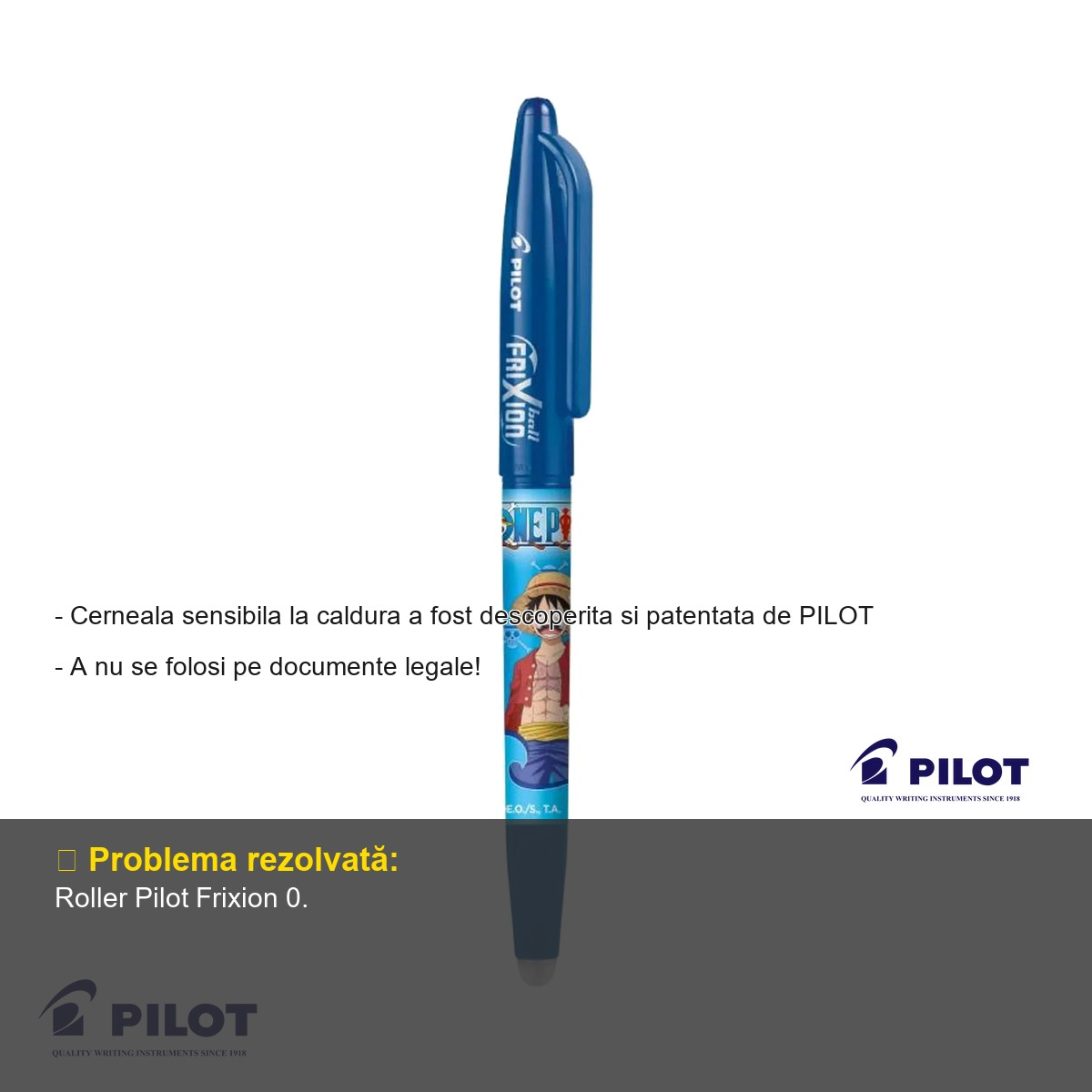 Daca iti doresti un instrument de scris care combina functionalitatea avansata cu un design atractiv si plin de personalitate, Roller-ul Pilot Frixion Ball 0.7 mm in editie limitata One Piece este alegerea perfecta. Fie ca esti student, profesionist sau fan al universului anime, acest roller iti ofera libertatea de a scrie, sterge si rescrie ori de cate ori este nevoie, fara a deteriora hartia. Cerneala termosensibila patentata de Pilot revolutioneaza experienta scrierii si elimina frustrarile cauzate de greselile ireversibile.