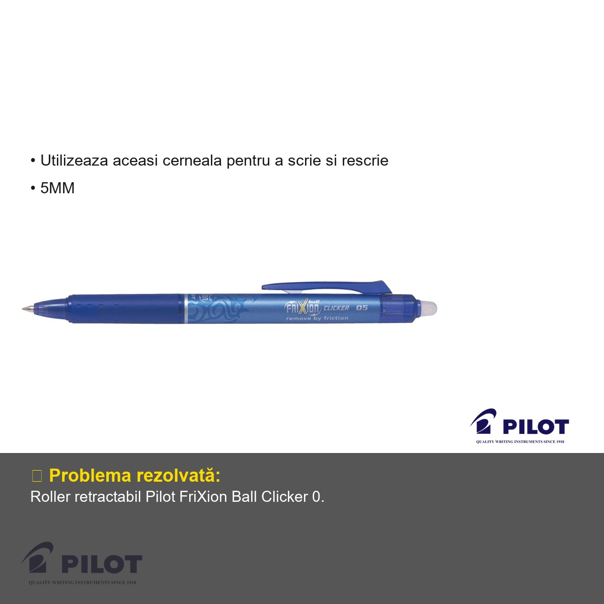 Principalul avantaj al roller-ului Pilot FriXion Ball Clicker este tehnologia de cerneala termo-sensibila care permite stergerea completa a scrisului prin simpla frecare cu radiera integrata. Spre deosebire de corectoarele clasice, stergerea se face fara urme, fara deteriorarea hartiei si fara a lasa pete sau reziduuri albe. Mecanismul retractabil de tip clicker asigura protejarea varfului atunci cand rollerul nu este folosit, prevenind murdaria si deteriorarea acestuia. Grosimea de 0.5 mm a varfului garanteaza o linie fina si precisa, potrivita atat pentru scris cat si pentru notite detaliate sau completarea spatiilor mici din plafoane sau formulare. Cerneala albastra ofera un contrast vizual placut si clar pe hartia alba, reducand oboseala ochilor la citire. Designul ergonomic si mecanismul simplu de actionare fac din acest roller un instrument de scris confortabil pentru utilizare indelungata.