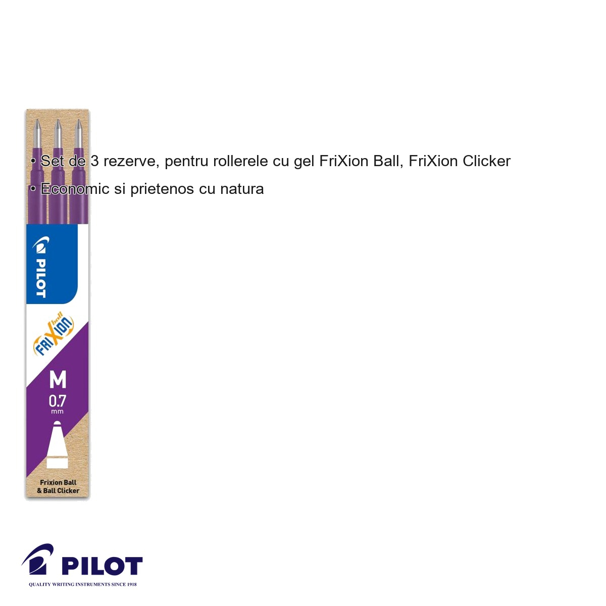 Principalul avantaj al acestor rezerve este tehnologia de cerneala termosensibila Pilot FriXion, care iti ofera libertatea de a corecta orice greseala fara a folosi corector lichid sau banda corectoare. Scriitura este curata, fluida si precisa datorita varfului de 0.7mm, ideal pentru un scris lizibil si ingrijit. In plus, cumparand un set de 3 rezerve, te asiguri ca nu ramai fara mina la un moment nepotrivit, avand mereu un stoc de rezerva la indemana. Din punct de vedere economic, inlocuirea rezervei este mult mai avantajoasa decat achizitionarea unui roller nou, iar din punct de vedere ecologic, reduci cantitatea de plastic aruncata, contribuind la un consum mai responsabil. Culoarea violet este o alegere eleganta si distinctiva, perfecta pentru a diferentia categorii de informatii sau pur si simplu pentru a adauga un element personal stilului tau de scris.