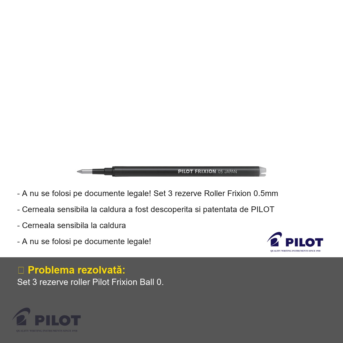 Aceste rezerve sunt recomandate exclusiv pentru instrumente de scris compatibile din gama Pilot Frixion Ball. Este important de retinut ca cerneala termosensibila nu este recomandata si nu trebuie folosita pe documente cu caracter legal sau oficial, deoarece scrierea poate deveni invizibila la temperaturi ridicate. Pastreaza documentele scrise cu cerneala Frixion la temperatura camerei, ferite de surse directe de caldura. Rezervele se inlocuiesc simplu si rapid, mentinand performanta optima a instrumentului de scris. Dupa stergere, cerneala poate deveni vizibila din nou daca documentul este expus la frig, ceea ce este un aspect important de cunoscut pentru utilizatorul avizat.