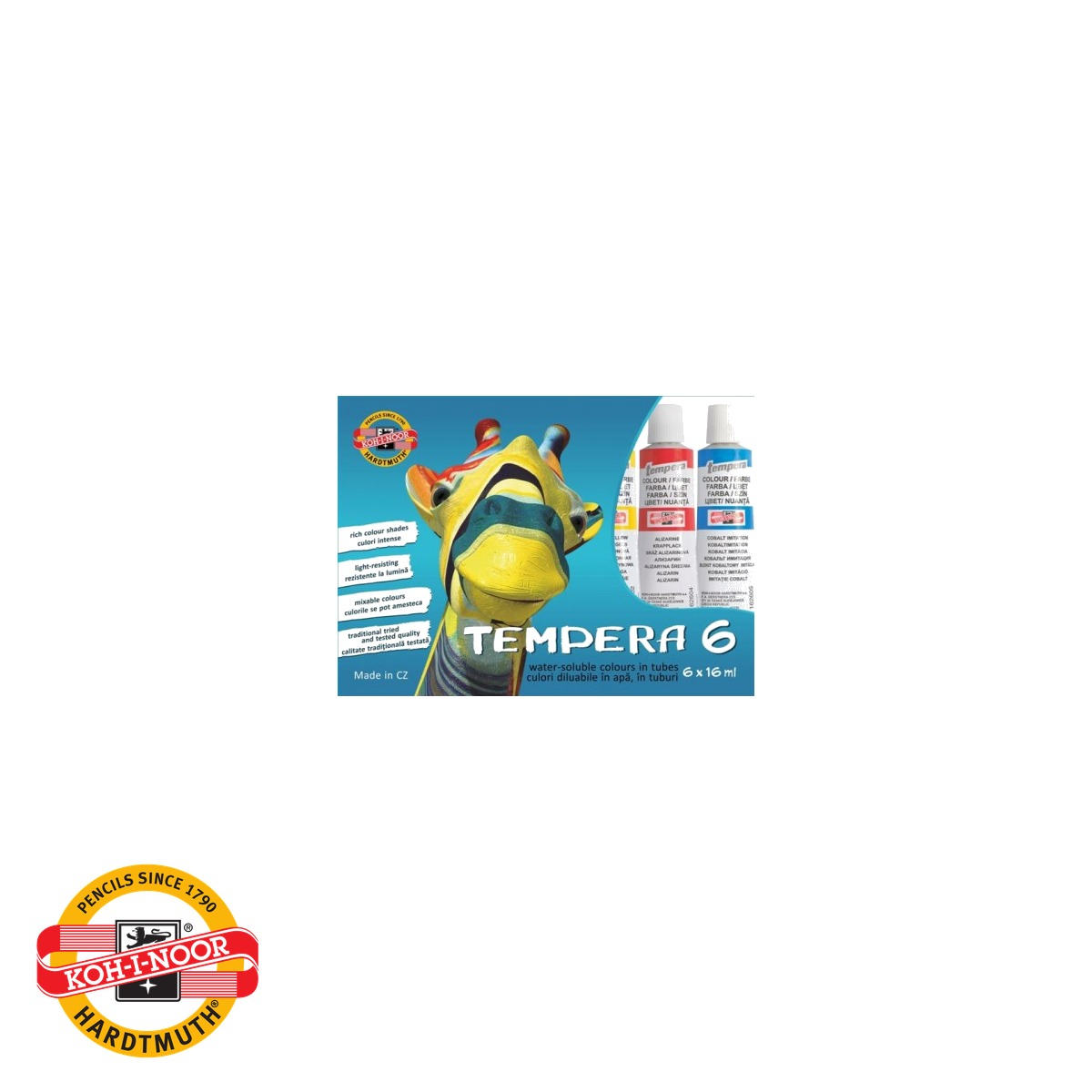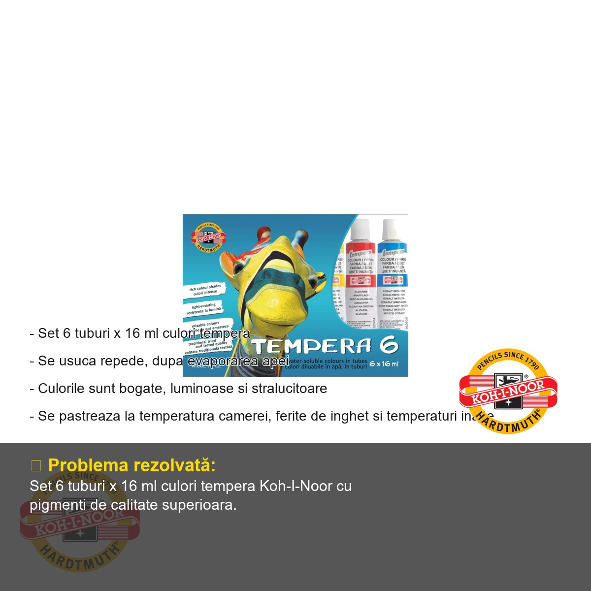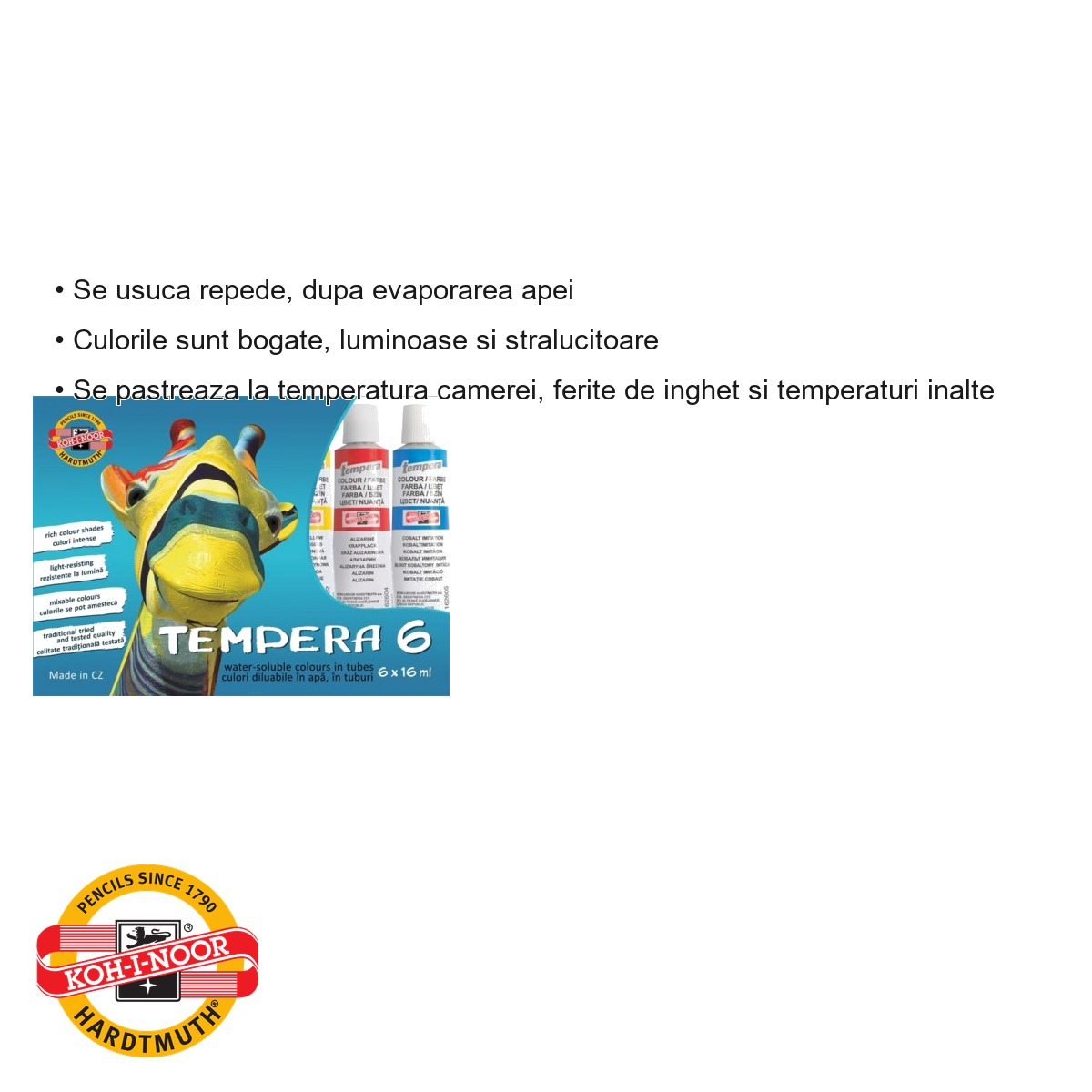 Culorile tempera Koh-I-Noor se remarca printr-o formula atent elaborata care combina pigmenti organici si anorganici de inalta calitate intr-o emulsie uleiosa cu liant vegetal. Aceasta baza speciala asigura o distributie fina si perfecta a pigmentilor, ceea ce se traduce in culori deosebit de bogate, luminoase si stralucitoare pe orice suprafata. Un avantaj important al acestor culori este usurinta cu care se dizolva in apa, fara a necesita solventi sau substante chimice agresive, ceea ce le face sigure si prietenoase pentru utilizatorii de toate varstele. Culorile pot fi amestecate intre ele fara dificultate, permitand obtinerea unei game largi de nuante pornind de la cele 6 culori din set. De asemenea, acestea au capacitatea unica de a reactiva si dizolva straturile de culoare deja uscate, oferind flexibilitate in procesul de lucru si posibilitatea de a face corectii sau suprapuneri de straturi. Uscarea rapida dupa evaporarea apei reduce timpul de asteptare si permite continuarea lucrarii intr-un timp scurt.
