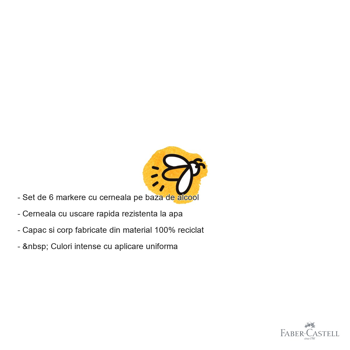 Setul Goldfaber Bold and Easy de la Faber-Castell vine cu o serie de avantaje clare fata de markerele obisnuite. In primul rand, dubla functionalitate a fiecarui marker elimina nevoia de a schimba instrumentele constant: varful flexibil tip pensula permite trasaturi de diferite grosimi in functie de presiunea aplicata, ideal pentru colorare expresiva si lettering, in timp ce varful tip liner asigura linii fine si precise, perfecte pentru contururi si detalii. Cerneala pe baza de alcool garanteaza o aplicare uniforma, fara striuri vizibile, si culori intense care raman vibrante pe hartie. Dupa uscare, cerneala devine rezistenta la apa, ceea ce inseamna ca lucrarile tale sunt durabile si nu se sterg accidental. Un alt avantaj important este angajamentul de sustenabilitate: corpul si capacul markerelor sunt fabricate din material 100% reciclat, ceea ce face acest produs o alegere responsabila fata de mediu. In plus, brandul Faber-Castell este sinonim cu calitate si fiabilitate, garantand o experienta placuta de utilizare pentru orice nivel de experienta.