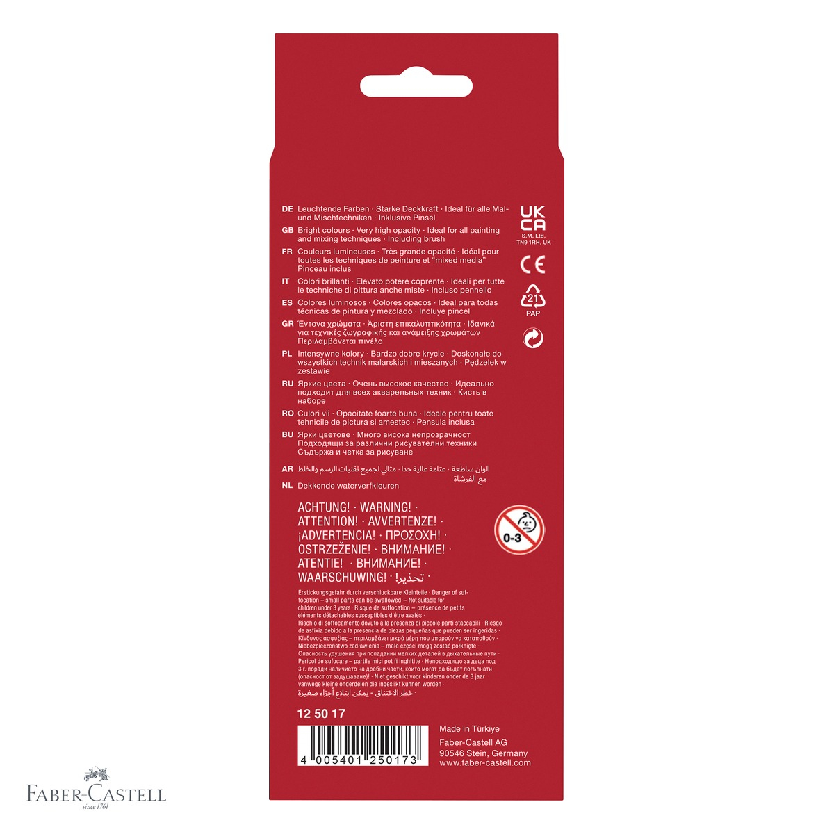 Setul de acuarele Faber-Castell se remarca prin calitatea superioara a pigmentilor folositi, care asigura culori luminoase si vibrante pe hartie. Puterea mare de acoperire inseamna ca micii artisti pot obtine nuante intense chiar si cu o cantitate mica de vopsea, ceea ce face produsul economic si durabil in timp. Paleta bogata de 12 culori ofera suficienta varietate pentru a crea lucrari complexe si expresive, iar posibilitatea de a amesteca culorile deschide noi orizonturi creative. Cutia de plastic practica protejeaza pastilele de deteriorare si permite transportul usor in ghiozdan sau geanta, fara riscul de a murdari alte obiecte. Pensula inclusa reprezinta un avantaj semnificativ, deoarece setul este complet si gata de utilizare imediat dupa cumparare, fara a fi necesara achizitionarea separata a altor accesorii.