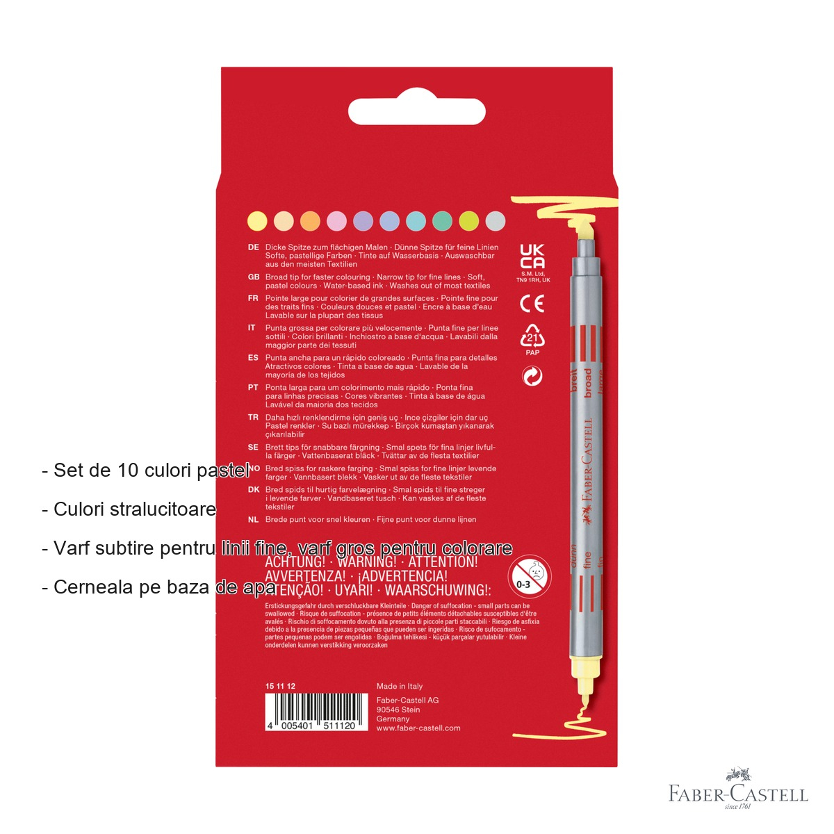 Culorile pastel stralucitoare ale setului ofera o paleta distincta fata de cariocile clasice, permitand creatii cu un aspect delicat si modern. Cele 10 nuante sunt variate si complementare, acoperind o gama larga de nevoi creative. Calitatea garantata de brandul Faber-Castell asigura o cerneala uniforma, fara intreruperi sau pete nedorite in timpul utilizarii.