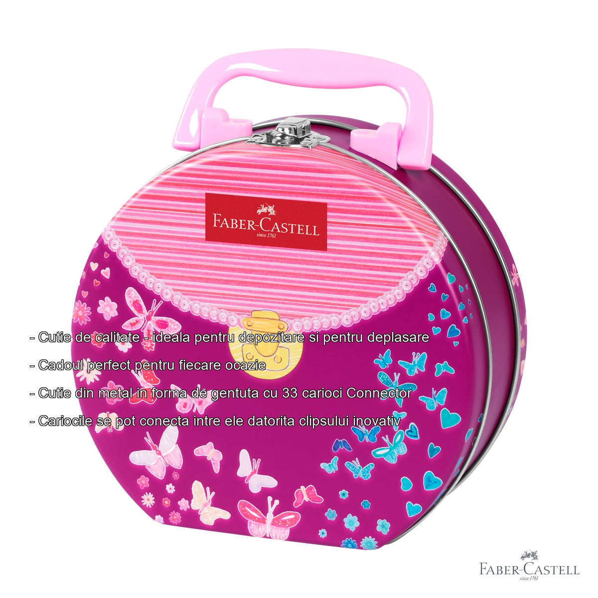 Fie ca vorbim despre orele de desen de la scoala, activitatile creative de acasa sau momentele de relaxare prin colorat, un set de carioci de calitate face diferenta. Setul de 33 carioci Faber-Castell Connector este alegerea ideala pentru copii si adulti care vor sa se bucure de culori vibrante, o scriere fluida si un accesoriu de depozitare pe masura. Cutia metalica in forma de gentuta nu este doar practica, ci si eleganta, transformand acest set intr-un cadou perfect pentru orice ocazie.