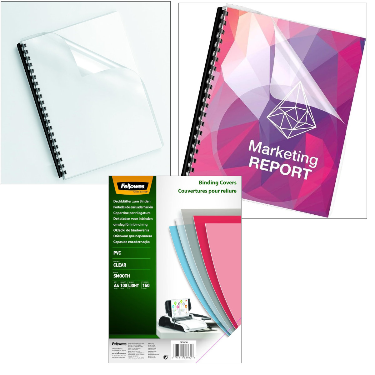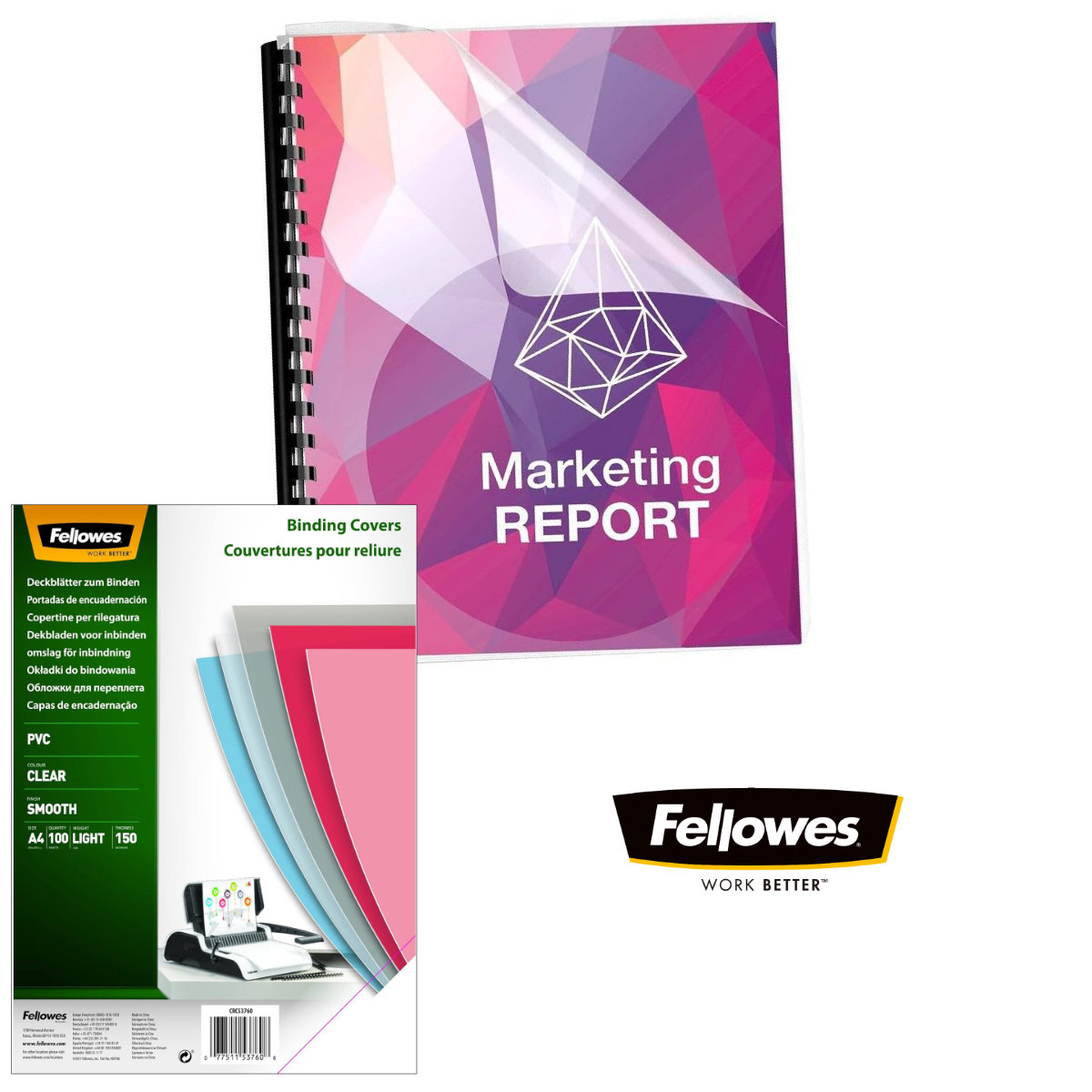 Setul de 100 de coperti plastic A4 de 150 microni, transparente, de la Fellowes este solutia ideala pentru a finaliza rapoarte, manuale, prezentari, proiecte sau portofolii cu un finisaj elegant si profesional.
