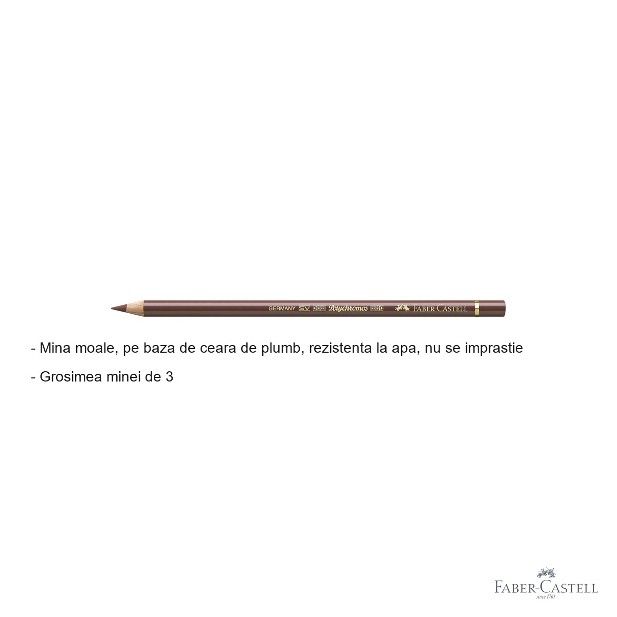 Creionul este construit dupa standardele ridicate ale brandului Faber-Castell, cunoscut la nivel mondial pentru durabilitatea si fiabilitatea produselor sale. Corpul creionului protejeaza eficient mina, reducand riscul de rupere la ascutire sau in utilizare curenta.