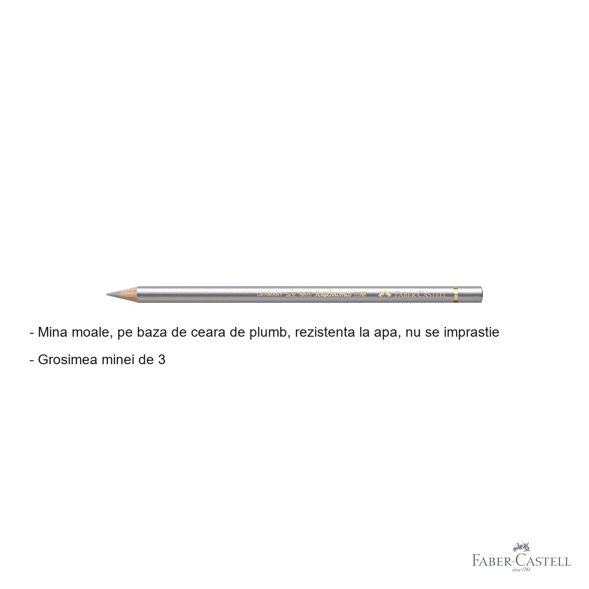 Creionul colorat Polychromos Faber-Castell argintiu ofera o serie de avantaje clare fata de creioanele standard. In primul rand, calitatea deosebita a pigmentilor asigura o culoare stabila in timp, care nu se decoloreaza la expunerea la lumina, ceea ce inseamna ca lucrarile tale isi pastreaza prospetimea si intensitatea ani de zile. Mina cu diametru de 3.8 mm este suficient de groasa pentru a permite trasaturi late si acoperire buna a suprafetei, dar totodata permite si detalii fine atunci cand este ascutit corespunzator.