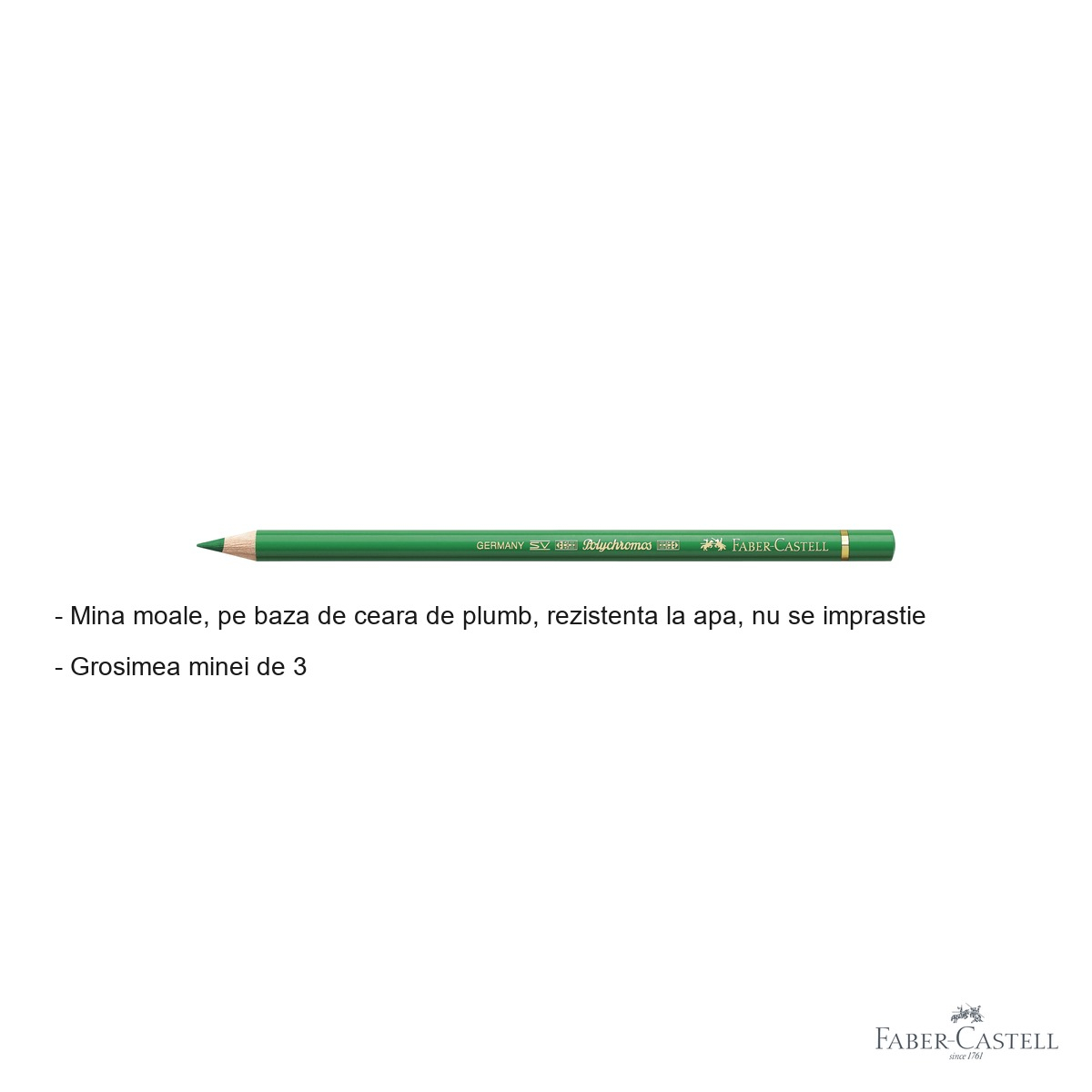 Gama Polychromos de la Faber-Castell este recunoscuta la nivel mondial ca una dintre cele mai apreciate game de creioane colorate pentru profesionisti. Mina moale pe baza de ceara de plumb permite aplicarea uniforma a culorii, fara a rupe varful in timpul lucrului. Grosimea de 3.8 mm a minei ofera un echilibru perfect intre precizie si acoperire, permitand atat detaliile fine, cat si colorarea unor suprafete mai mari. Rezistenta la apa inseamna ca lucrarile tale sunt protejate impotriva umezelii accidentale, iar culorile nu se vor estompa sau imprastia nedorit. Stabilitatea la lumina garanteaza ca lucrarile isi pastreaza prospetimea si vivacitatea pe termen lung, ceea ce este esential pentru lucrarile destinate expunerii sau arhivarii. Nuanta de verde smarald este bogata, saturata si versatila, putand fi folosita atat ca ton de baza, cat si in combinatie cu alte culori din gama Polychromos pentru efecte de degradeu sau mixaj optic.