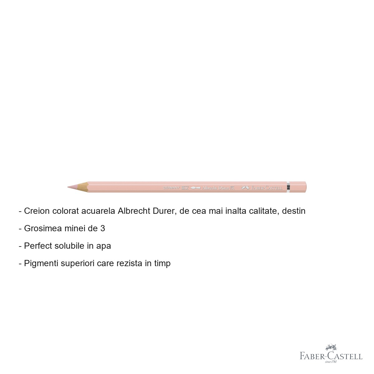 Pentru artistii care cauta versatilitate maxima in exprimarea artistica, creionul colorat acuarela Albrecht Durer de la Faber-Castell reprezinta instrumentul ideal pentru combinarea tehnicilor de desen cu efectele rafinate ale acuarelei. Nuanta flesh mediu 132 este esentiala pentru redarea tonurilor de piele si a detaliilor portretistice, oferind posibilitati nelimitate de expresie artistica.