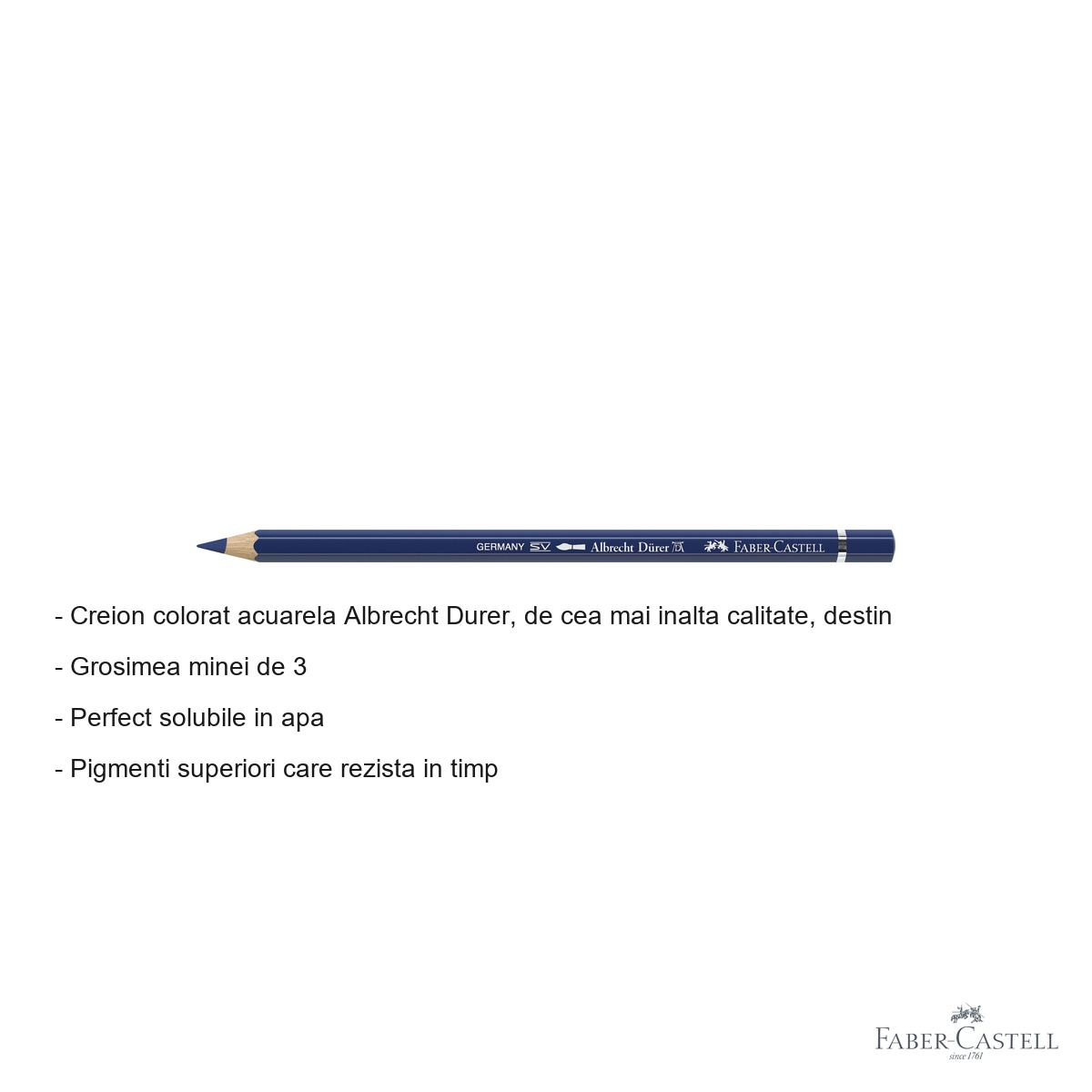 Creion colorat acuarela premium Albrecht Durer cu mina groasa 3.8mm, perfect solubil in apa. Pigmenti superiori cu rezistenta maxima la lumina, ideal pentru tehnici mixte de desen si acuarela. Calitate profesionala Faber-Castell.