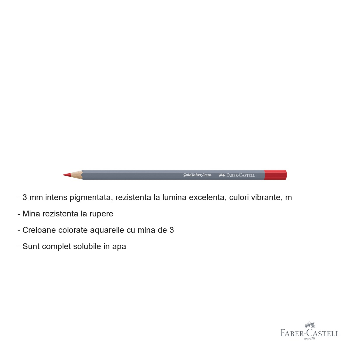 Avantajul major al acestui creion colorat aquarelle consta in versatilitatea sa - puteti lucra uscat pentru detalii precise sau puteti aplica apa cu o pensula pentru a transforma desenul intr-o pictura fluida. Tehnologia moderna utilizata de Faber-Castell asigura o mina moale care depune culoarea uniform, permitand acoperirea suprafetelor mari cu usurinta. Rezistenta la lumina garanteaza ca lucrarile dumneavoastra vor ramane la fel de vibrante peste ani.