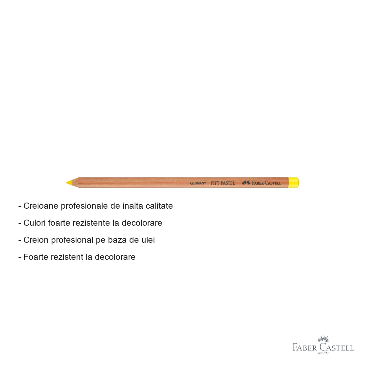 Unul dintre cele mai importante avantaje ale creionului pastel Pitt Faber-Castell este concentratia ridicata de pigmenti de calitate superioara. Aceasta inseamna ca fiecare linie trasata este intensa, uniforma si expresiva, fara a necesita presiune exagerata pe hartie. Rezistenta foarte ridicata la decolorare garanteaza ca lucrarile tale vor pastra prospetimea culorilor pe termen lung, ceea ce este esential pentru lucrari expuse sau arhivate. Gradul de duritate mediu asigura un echilibru optim intre flexibilitate si control, permitandu-ti atat umbriri delicate, cat si linii clare si precise. Nuanta de galben crom inchis este o culoare calda, bogata, versatila, care se integreaza perfect intr-o paleta larga de compozitii cromatice.