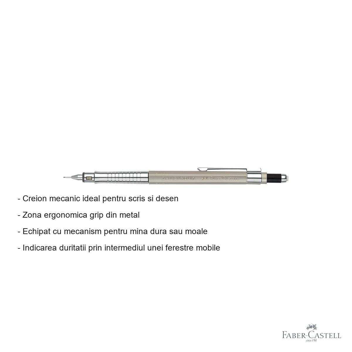 Avantajele utilizarii acestui creion mecanic Faber-Castell sunt multiple. Mecanismul pentru mine dure sau moi permite adaptarea instrumentului la diverse tipuri de activitati - de la schite usoare pana la linii puternice si contururi marcate. Zona grip metalica nu doar confera un aspect premium, dar asigura si o prindere ferma si confortabila, reducand oboseala mainii in sesiuni prelungite de lucru. Fereastra mobila pentru indicarea duritatii reprezinta o caracteristica deosebit de utila pentru cei care lucreaza cu diferite tipuri de mine si necesita o identificare rapida.