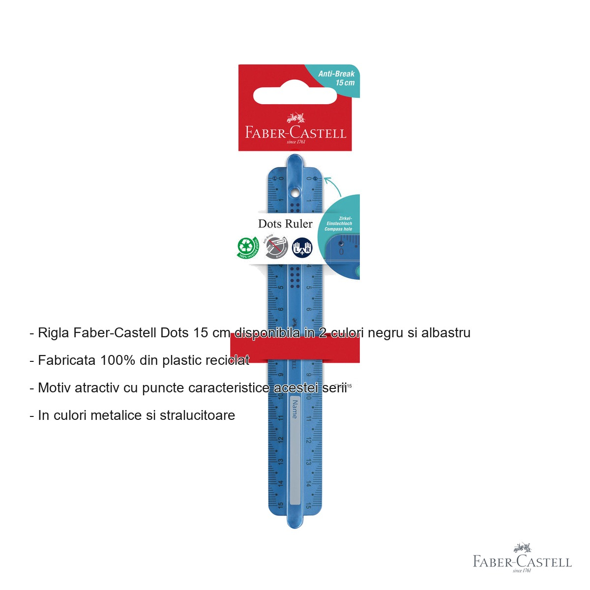 Rigla Faber-Castell Dots 15 cm vine cu o serie de avantaje clare pentru utilizator. In primul rand, designul seriei Dots cu motive de puncte in culori metalice si stralucitoare o face usor de identificat in penar si de apreciat vizual, transformand un obiect banal intr-unul atractiv. Dimensiunea de 15 cm o face compacta si usor de transportat, incapand fara probleme in orice penar sau geanta de scoala.