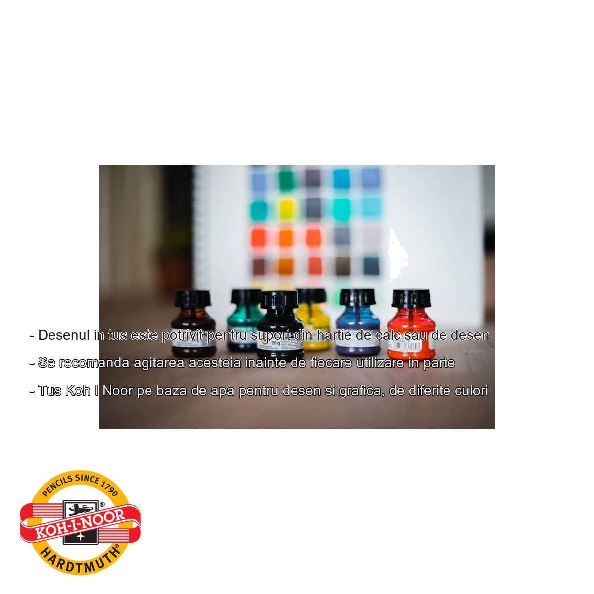Tusul negru Koh-I-Noor pe baza de apa ofera o serie de avantaje clare pentru utilizatorii sai. In primul rand, formula pe baza de apa il face mai usor de manevrat si mai sigur de utilizat in spatii inchise, fara mirosuri puternice sau substante agresive. Pigmentul intens asigura un negru profund si omogen, esential pentru vizibilitatea si claritatea desenelor tehnice sau artistice. Cantitatea de 20g este suficienta pentru mai multe sesiuni de lucru, oferind un raport bun intre pret si cantitate. In plus, brandul Koh-I-Noor garanteaza o calitate constanta a produselor sale, testate si apreciate de profesionisti si studenti deopotriva.