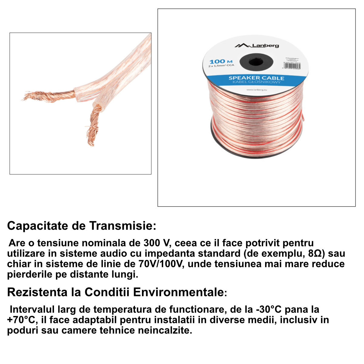 Rola Cablu Audio Boxe Profesional 2X1.5MM2, 100M, Transparent, pentru Instalatii Fixe si Difuzare Sonora, Cupru CCA