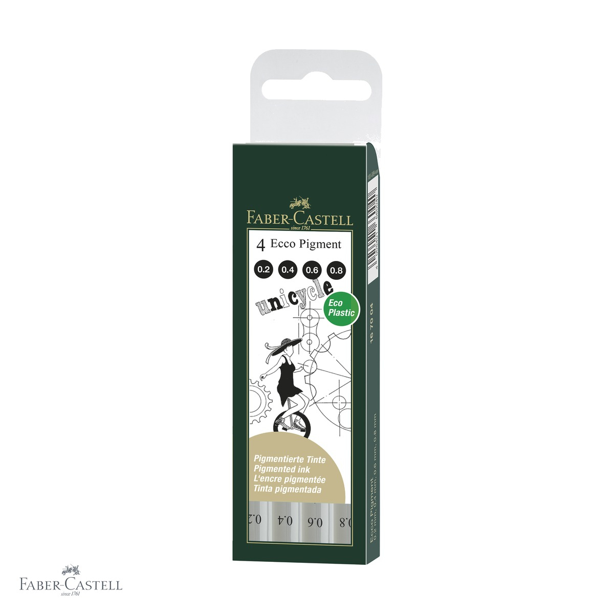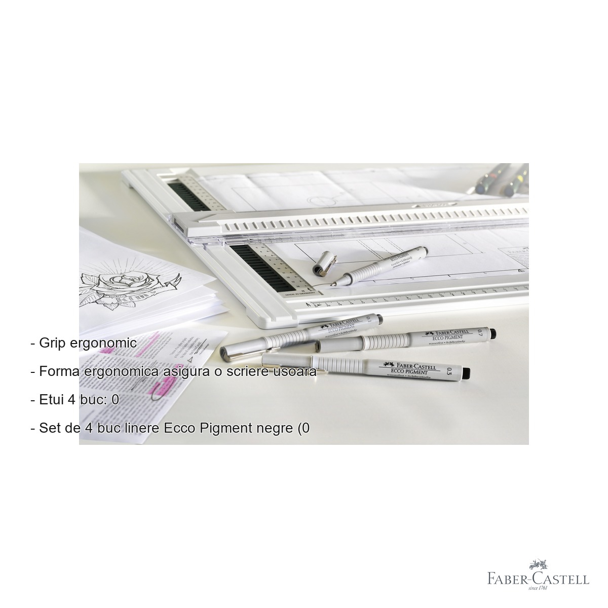 Daca esti in cautarea unor instrumente de trasare fiabile, cu rezultate constante si de calitate profesionala, setul de 4 linere Faber-Castell Ecco Pigment este alegerea potrivita. Indiferent daca esti arhitect, designer, ilustrator, student la arte sau pasionat de desen tehnic, aceste linere iti ofera controlul perfect asupra fiecarei linii. Pigmentul negru intens, rezistenta la apa si lumina, precum si varful lung din metal fac din acest set un instrument de incredere pentru orice tip de lucrare grafica sau tehnica. In plus, corpul si capacul sunt fabricate din material plastic reciclat, ceea ce face ca acest produs sa fie si o alegere responsabila fata de mediu.
