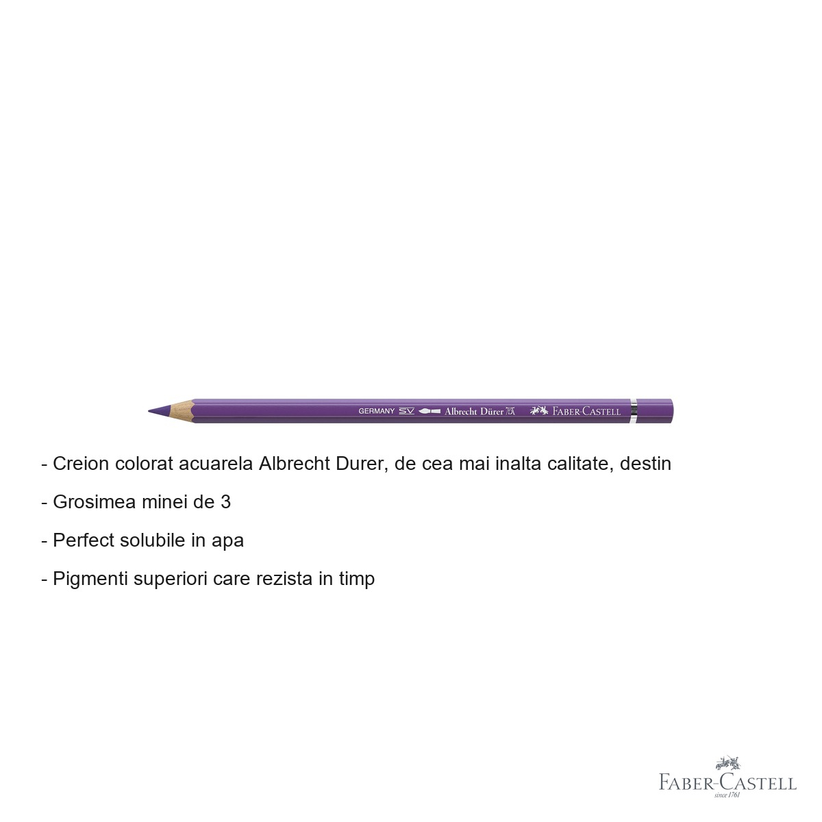 Pentru artistii care cauta versatilitate maxima in exprimarea artistica, creionul colorat acuarela Albrecht Durer de la Faber-Castell reprezinta instrumentul ideal. Aceasta unealta de desenat combina precizia unui creion colorat traditional cu fluiditatea si expresivitatea acuarelei, permitand realizarea unor lucrari complexe si nuantate. Nuanta violet mangan 160 ofera o culoare intensa si profunda, perfecta pentru umbre, detalii florale sau peisaje de seara.