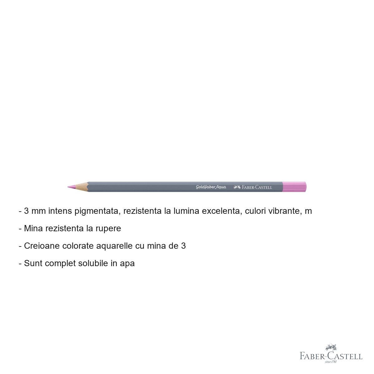 Pentru artistii care doresc sa combine precizia desenului cu fluiditatea picturii, creionul colorat acuarela Goldfaber de la Faber-Castell reprezinta instrumentul perfect. Acest creion profesional in nuanta magenta deschis (cod 119) ofera versatilitatea necesara pentru a crea lucrari de arta complexe, permitand trecerea usoara de la tehnica uscata la cea umeda.
