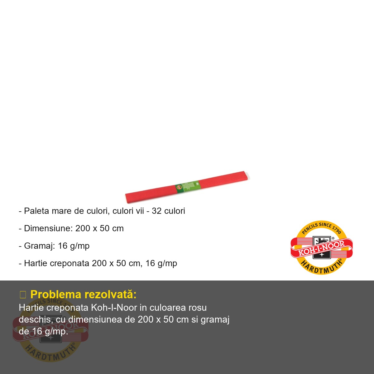 Activitatile creative reprezinta o parte esentiala a dezvoltarii copiilor si a hobby-urilor artistice pentru orice varsta. Hartia creponata Koh-I-Noor in nuanta de rosu deschis este un material versatil si usor de utilizat, potrivit atat pentru activitatile scolare, cat si pentru proiectele de craft acasa. Cu o textura usor ondulata, specifica hartiei creponata, aceasta ofera flexibilitate si usor de modelat, permitand realizarea unor decoratiuni deosebite, flori artificiale, pompoane, garland-uri si multe alte creatii originale. Brandul Koh-I-Noor, cunoscut pentru calitatea materialelor sale de papetarie si birotica, garanteaza o culoare vie si uniforma pe toata suprafata hartiei.