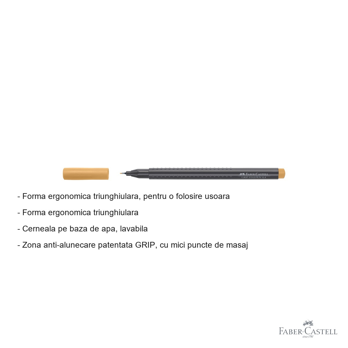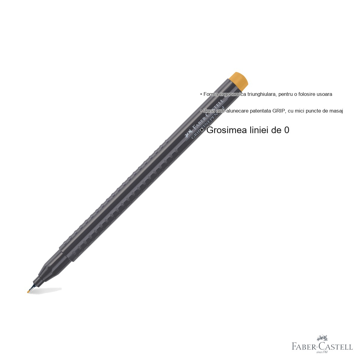 Linerul Faber-Castell Grip 0.4 mm maro-ocru combina performanta tehnica cu confortul fizic intr-un singur instrument. Zona Grip anti-alunecare patentata, cu micile sale puncte de masaj, reduce oboseala mainii chiar si in sesiunile lungi de lucru, oferind o prindere sigura si stabila. Forma corpului triunghiulara a fost conceputa special pentru a se potrivi natural in mana, indiferent daca esti dreptaci sau stangaci.
