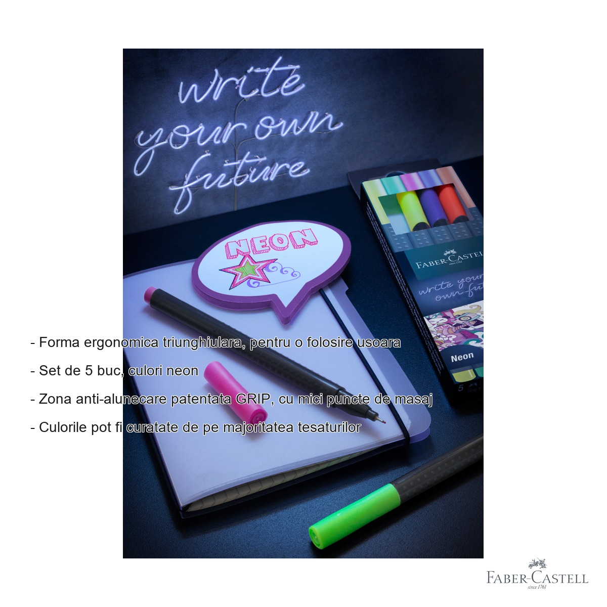 Set 5 linere neon Faber-Castell Grip 0.4mm, varf fin, forma ergonomica triunghiulara