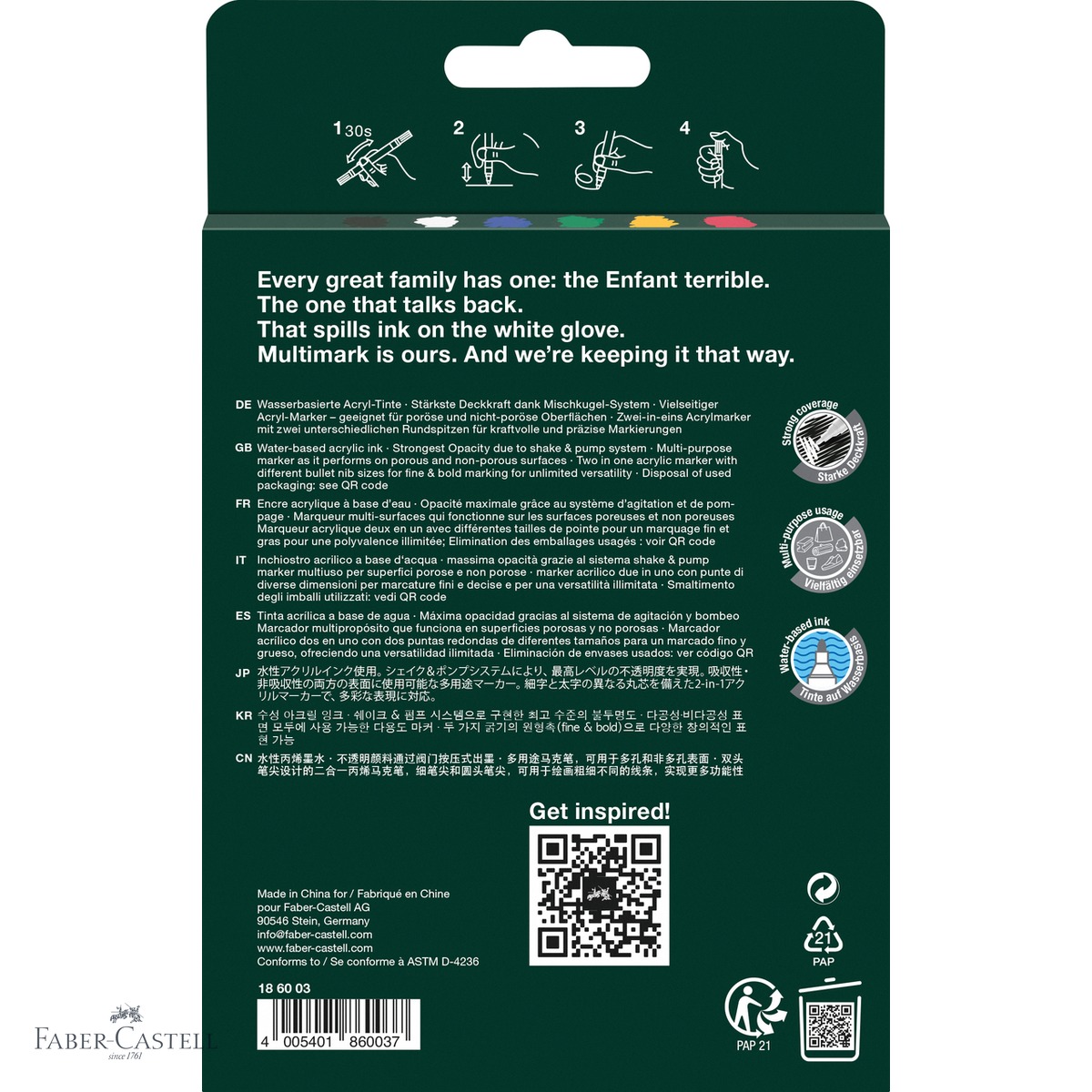 Daca esti artist, designer, meserias sau pur si simplu pasionat de activitati creative, setul de 6 markere acrilice Faber-Castell Multimark este alegerea ideala pentru proiectele tale. Fie ca lucrezi pe hartie, carton, lemn, panza, sticla, metal, piatra sau plastic, aceste markere iti ofera control, precizie si culori vibrante la fiecare utilizare. Cerneala opaca pe baza de apa asigura un rezultat profesional, cu acoperire excelenta chiar si pe suprafete inchise la culoare. Setul contine 6 culori de baza esentiale: alb, galben, rosu, verde, albastru si negru - o paleta completa pentru orice tip de creatie.