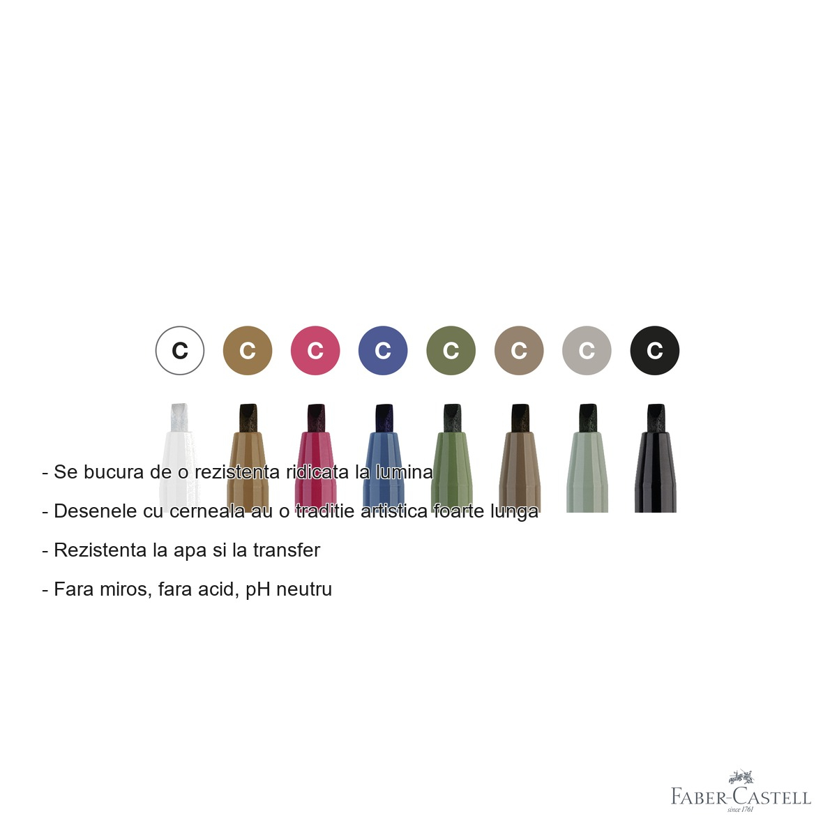 Markerele Faber-Castell Pitt Artist Pen se remarca prin calitatea cernelii pigmentate, care asigura culori intense si o excelenta rezistenta la lumina. Acest lucru inseamna ca lucrarile tale vor ramane vibrante si frumoase chiar si dupa multi ani. Cerneala rezistenta la apa permite utilizarea in combinatie cu tehnici umede, cum ar fi acuarela, fara riscul de a murdari sau dilua liniile deja trasate. Faptul ca nu trece prin hartie reprezinta un avantaj major, protejand atat lucrarea, cat si suprafetele de lucru. Formula fara acid si cu pH neutru face aceste markere potrivite si pentru lucrarile de arhiva sau colectiile valoroase, garantand longevitatea culorilor. Varful caligrafic de 2.5 mm ofera versatilitate in trasarea liniilor - de la linii subtiri la hasurate largi, in functie de unghiul de utilizare. Paleta de 8 culori selectate cu grija acopera un spectru util pentru compozitii artistice complete.
