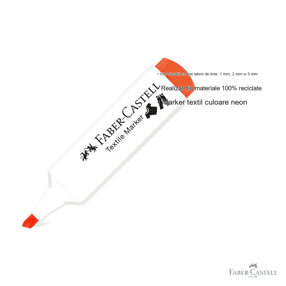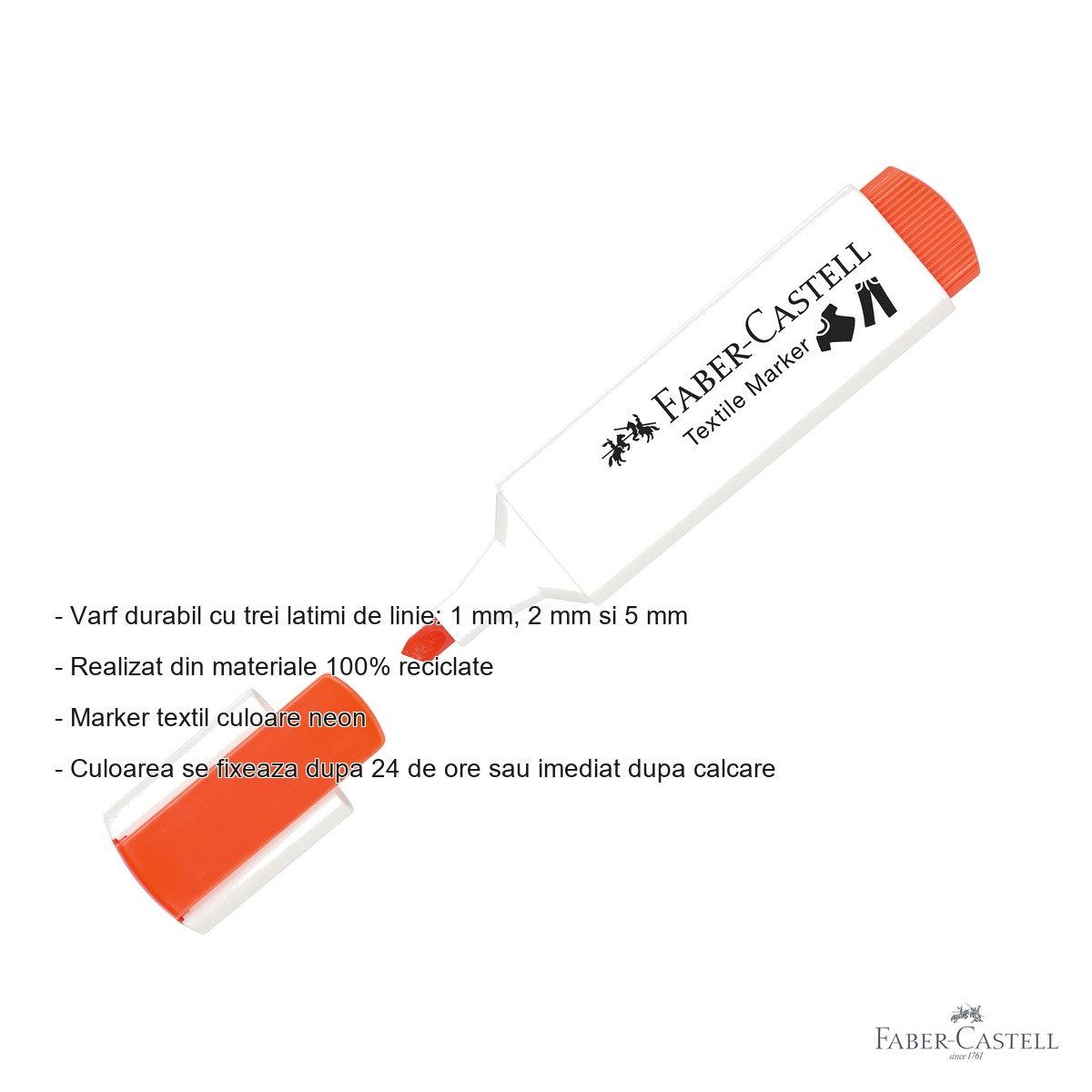 Daca iti doresti sa personalizezi tricouri, genti din panza, rucsacuri sau orice alt obiect textil, markerul textil neon portocaliu Faber-Castell este alegerea ideala. Fie ca esti artist, creator de continut, parinte care doreste sa marcheze hainele copilului sau designer amator, acest marker iti ofera precizie, culori vibrante si durabilitate pe tesaturi. Cu un design eco-friendly si o formula de cerneala special conceputa pentru fixare pe fibre textile, markerul Faber-Castell iti permite sa exprimi creativitatea fara limite.