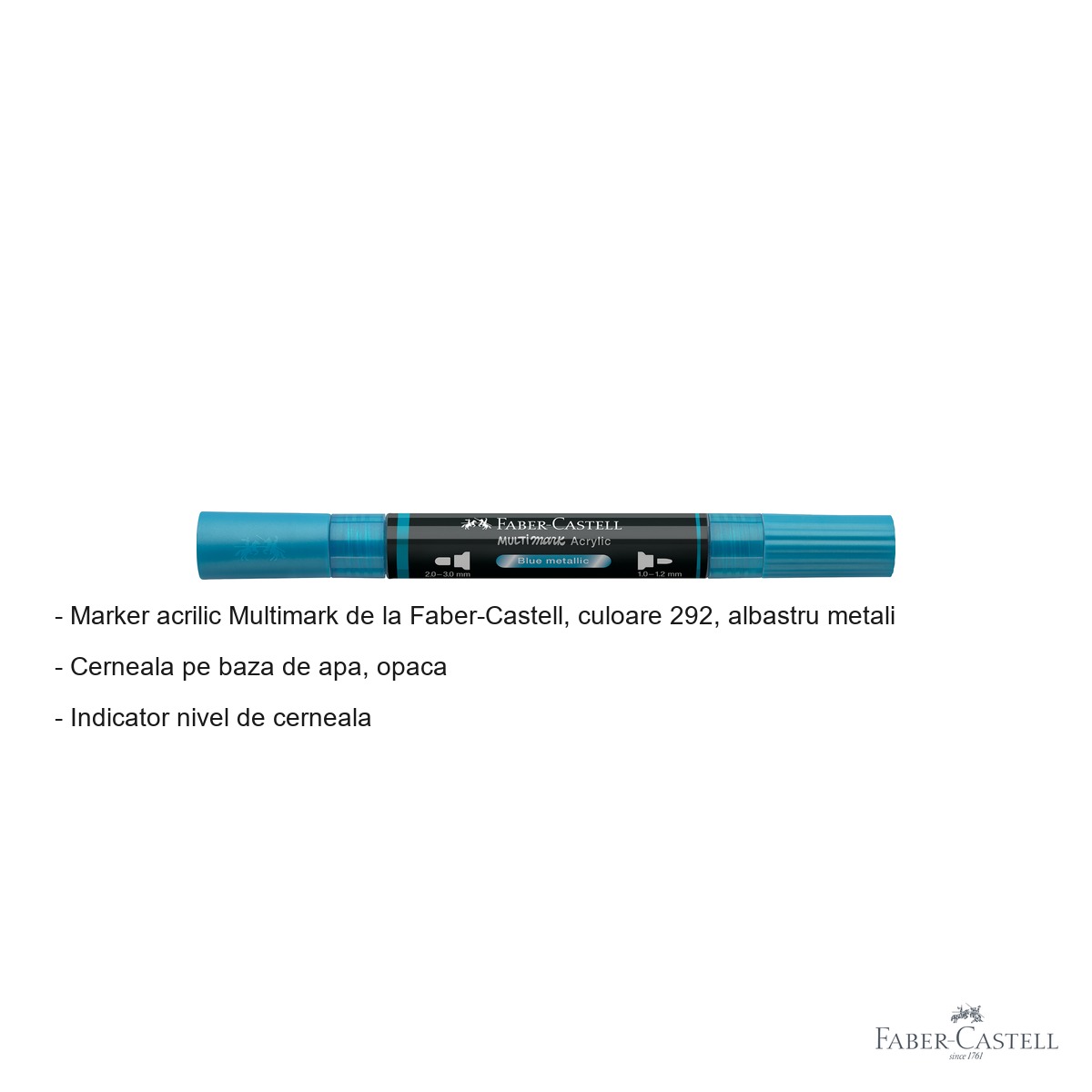 Marker acrilic Faber-Castell Multimark cu cerneala pe baza de apa, opaca, in nuanta albastru metalizat 292. Varf dublu (gros 2-3 mm si fin 1-1,2 mm) pentru acoperire larga si detalii precise. Compatibil cu hartie, lemn, sticla, metal, panza si multe alte suprafete.