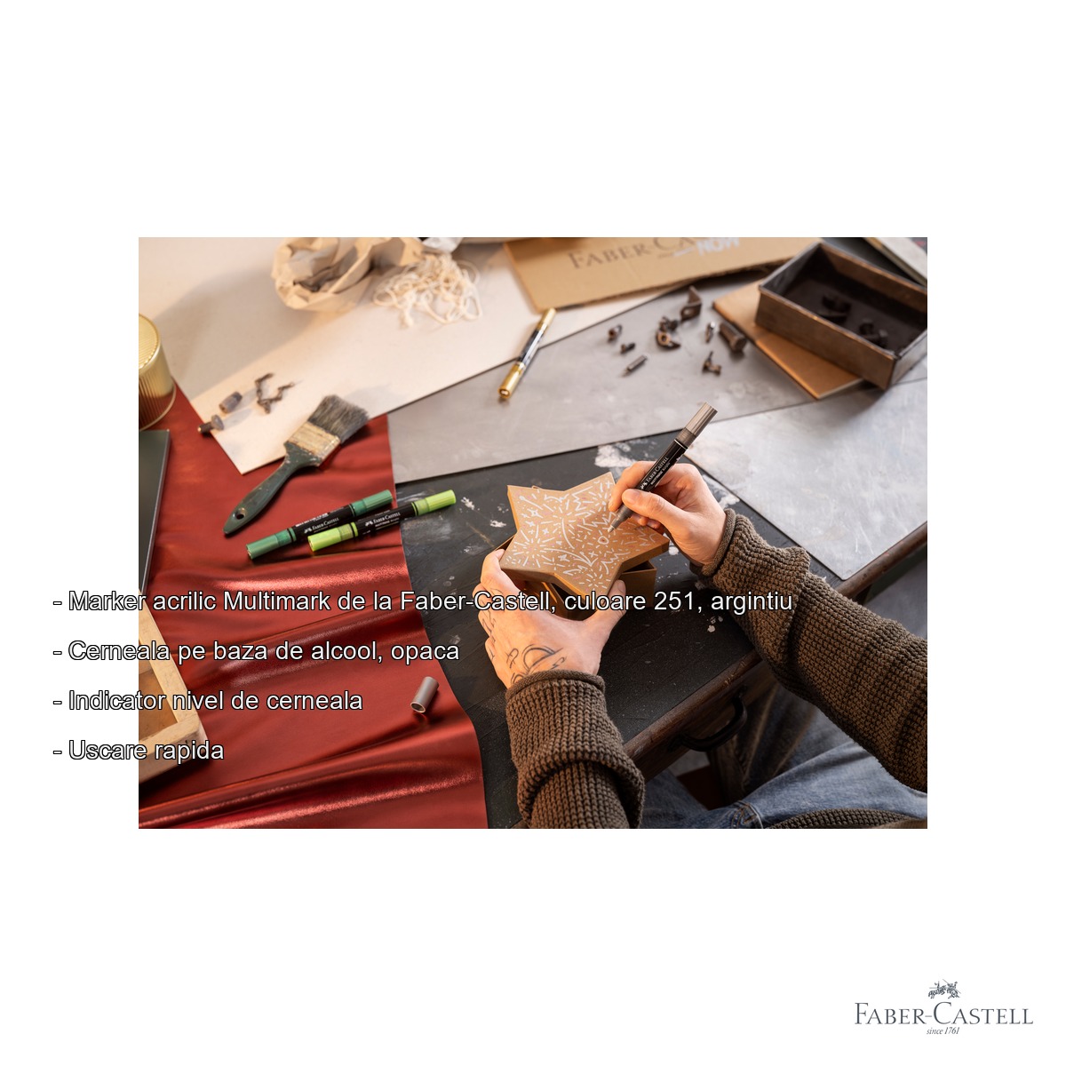 Fie ca esti artist, designer, meserias sau pasionat de DIY, ai nevoie de un marker care sa functioneze pe orice suprafata, sa ofere o culoare intensa si sa se usuce rapid. Markerul acrilic Multimark de la Faber-Castell, in culoarea argintiu 251, este exact instrumentul de care ai nevoie atunci cand vrei rezultate profesionale, indiferent de materialul pe care lucrezi. Cu o cerneala opaca pe baza de alcool si un varf dublu ingenios, acest marker iti ofera flexibilitate maxima si control precis in orice proiect creativ sau tehnic.