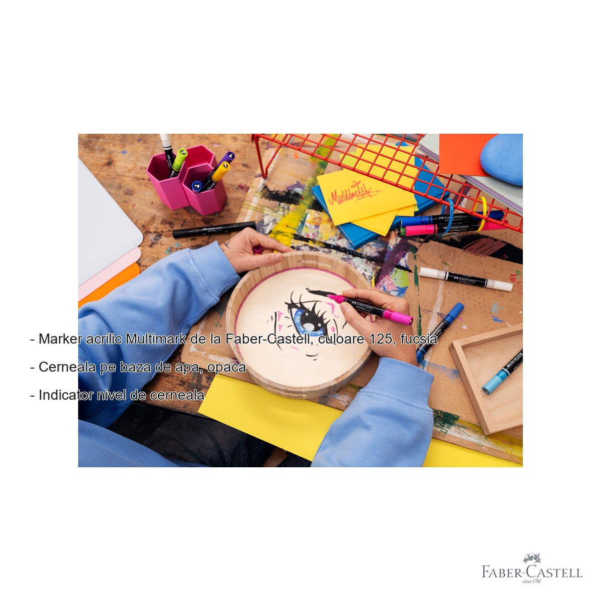 Daca esti in cautarea unui marker acrilic de calitate, capabil sa ofere culori vibrante si opace pe o varietate larga de suprafete, Marker acrilic Multimark Faber-Castell, culoare fucsia 125 este alegerea potrivita. Fie ca esti artist, designer, hobby-ist sau doar vrei sa personalizezi obiecte din casa, acest marker iti ofera controlul si versatilitatea necesare pentru rezultate profesionale. Culoarea fucsia intensa si cerneala opaca pe baza de apa garanteaza o acoperire excelenta, indiferent de suportul ales.