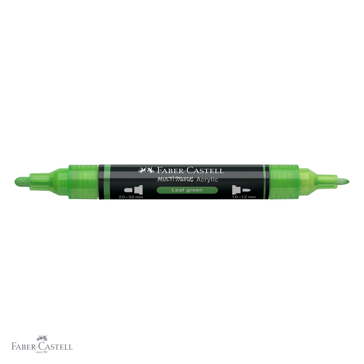 Marker acrilic Faber-Castell Multimark, culoare verde frunza 112, cu varf dublu (2-3 mm si 1-1,2 mm). Cerneala pe baza de apa, opaca, usor de aplicat pe hartie, lemn, sticla, metal si alte suprafete.