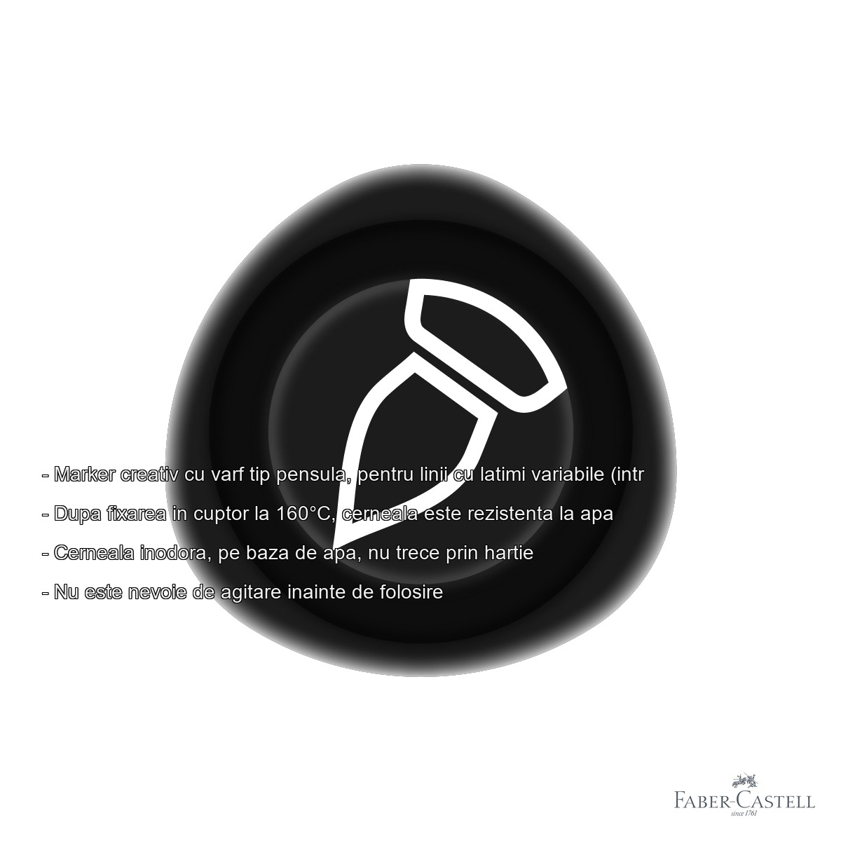Daca esti in cautarea unui marker de calitate superioara care sa iti ofere control total asupra liniei si sa functioneze pe o varietate larga de suprafete, Marker-ul creativ Faber-Castell Goldfaber negru cu varf tip pensula este alegerea potrivita. Fie ca esti artist, designer, student sau pur si simplu pasionat de activitati creative, acest marker iti pune la dispozitie un instrument fiabil, cu cerneala pe baza de apa, fara miros neplacut si fara riscul de a patrunde prin hartie. Faber-Castell, unul dintre cele mai respectate branduri din industria instrumentelor de scris si desen, garanteaza prin aceasta gama un echilibru perfect intre performanta tehnica si confort in utilizare.