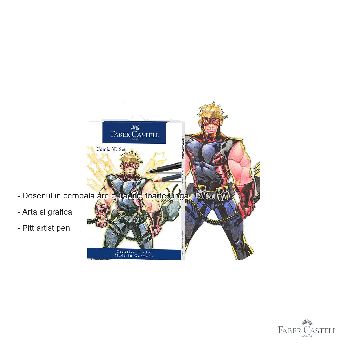 Daca esti pasionat de ilustratie, benzi desenate sau desen in cerneala si cauti un set complet care sa iti ofere toate instrumentele necesare intr-un singur pachet, Set Pitt Artist Pen Comic 11 piese Faber-Castell este alegerea potrivita. Desenul in cerneala are o traditie foarte lunga si a reprezentat mereu un mediu preferat de artisti si graficieni, datorita expresivitatii si durabilitatii pe care le ofera. Faber-Castell a combinat avantajele cernelii cu cele ale unui instrument modern si usor de utilizat - markerul cu pensula Pitt - pentru a crea un set dedicat ilustratorilor de benzi desenate si nu numai.