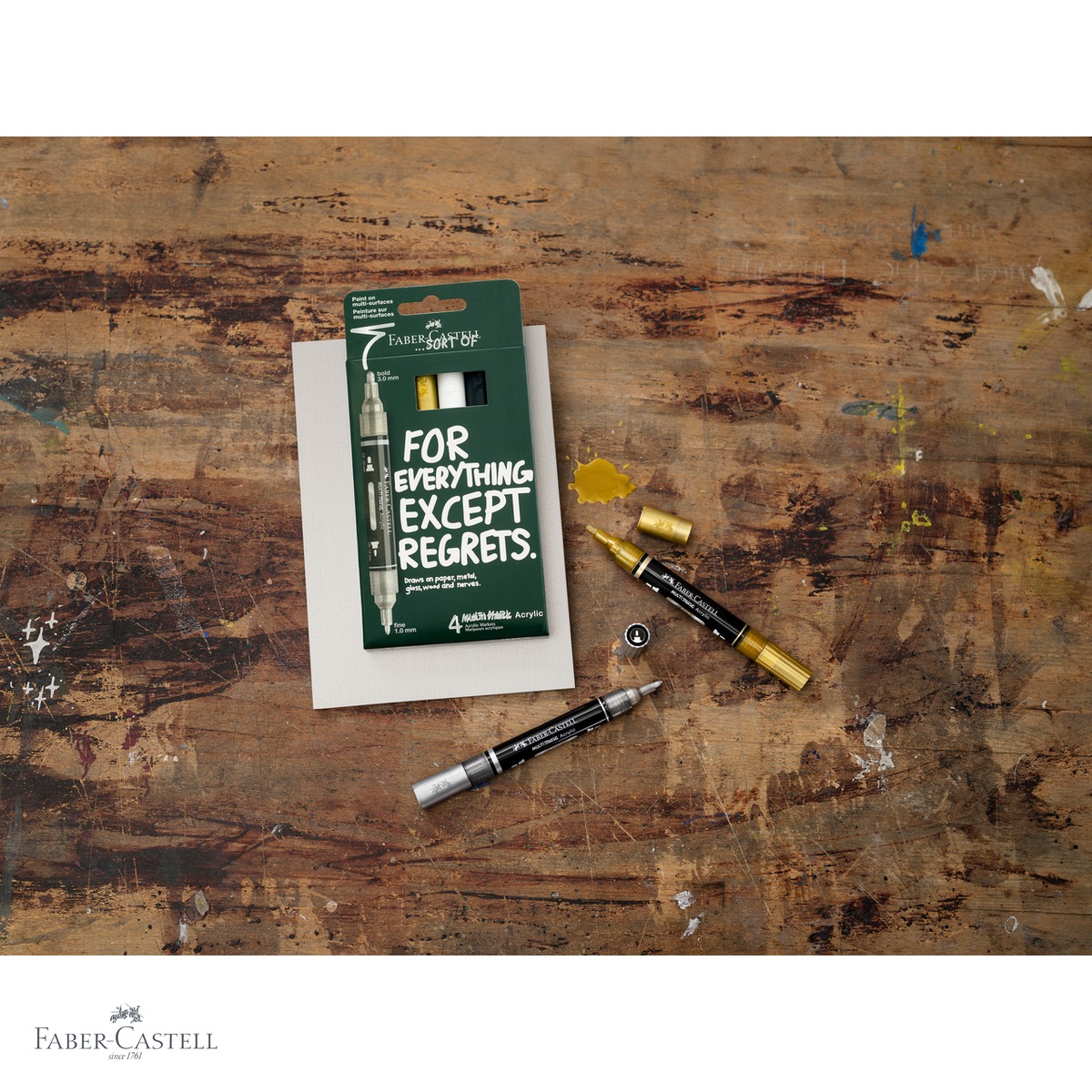Setul de markere acrilice Faber-Castell Multimark aduce cu sine o serie de avantaje clare fata de markerele obisnuite. In primul rand, cerneala acrilica pe baza de apa este opaca, ceea ce inseamna ca culorile acopera complet suprafata, inclusiv pe fonduri inchise. Culoarea alba si cea aurie sunt vizibile chiar si pe suprafete negre sau inchise la culoare, ceea ce le face ideale pentru efecte decorative deosebite. Varful dublu este un mare avantaj practic: poti trece rapid de la zone largi de acoperire la detalii fine si precise, fara a mai schimba instrumentul. Indicatorul de nivel al cernelii este o functie utila care te ajuta sa stii din timp cand trebuie sa inlocuiesti markerul, evitand intreruperile neplacute in mijlocul unui proiect. Faber-Castell este un brand cu traditie indelungata in productia de instrumente de scriere si desen, garantand o calitate constanta si fiabila a produselor sale.