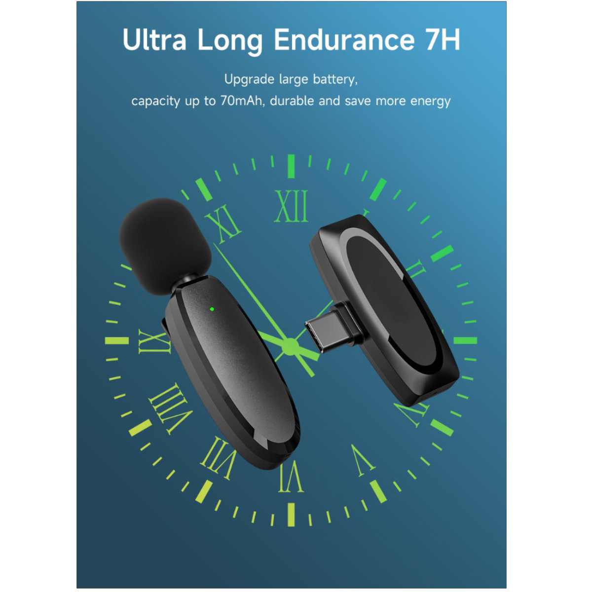 • Autonomie Extinsa si Incarcare in Utilizare: Bateria incorporata de 70 mAh asigura pana la 7 ore de inregistrare continua la o singura incarcare. Mai mult, microfonul suporta incarcarea in timp ce il folosesti. Poti sa-l conectezi la o baterie portabila sau la incarcator prin cablul USB-C, pentru sesiuni de streaming sau filmare nelimitate.