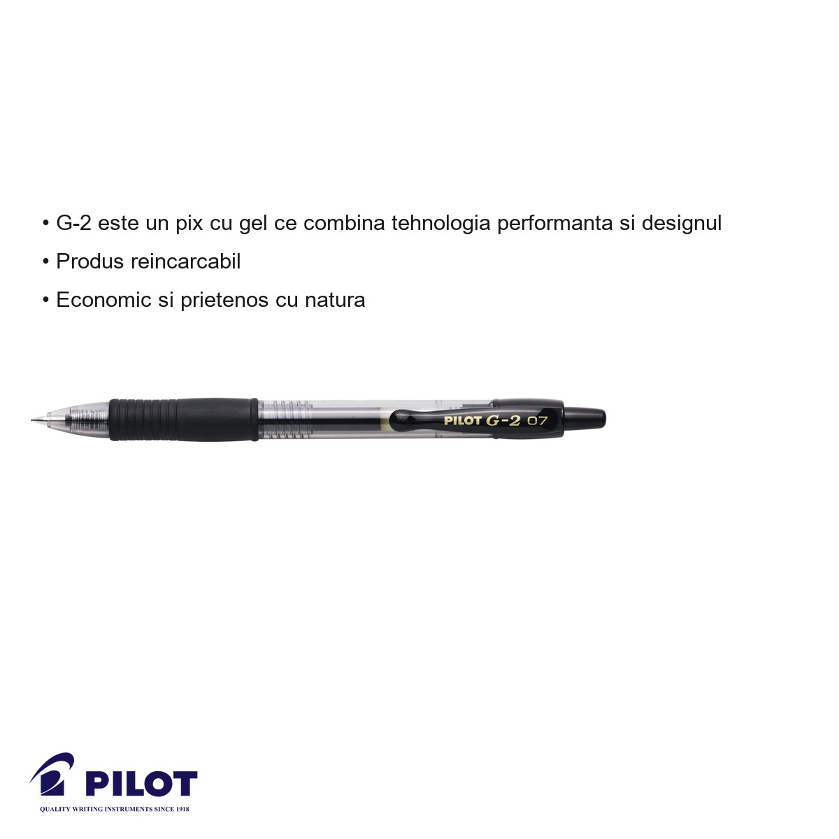 Pentru a obtine cele mai bune rezultate cu pixul Pilot G2, recomandam utilizarea pe suprafete de hartie de calitate buna, care nu este prea poroasa sau texturata excesiv - cerneala gel va adera uniform si va oferi un aspect ingrijit al scrisului. Evitati expunerea prelungita a varfului la aer, chiar daca mecanismul retractabil protejeaza bila atunci cand nu este in uz. La finalul utilizarii, asigurati-va ca mecanismul este retras pentru a prelungi durata de viata a rezervei. Atunci cand rezerva se goleste, inlocuiti-o cu o rezerva originala Pilot G2 compatibila cu modelul 0.7mm pentru a mentine aceleasi performante de scriere. Pixul este potrivit atat pentru dreptaci, cat si pentru stangaci, datorita designului simetric si gripului bine proporționat.