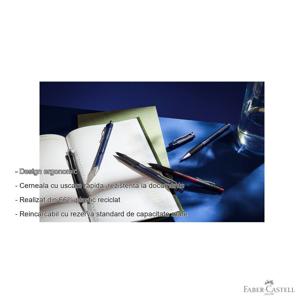 Pix cu mecanism Faber-Castell Beyond cu cerneala albastra si rezerva x-soft M pentru scriere uniforma si confortabila. Zona de prindere cauciucata, clips metalic durabil si corp realizat din 66% plastic reciclat. Reincarcabil cu rezerva standard de capacitate mare.