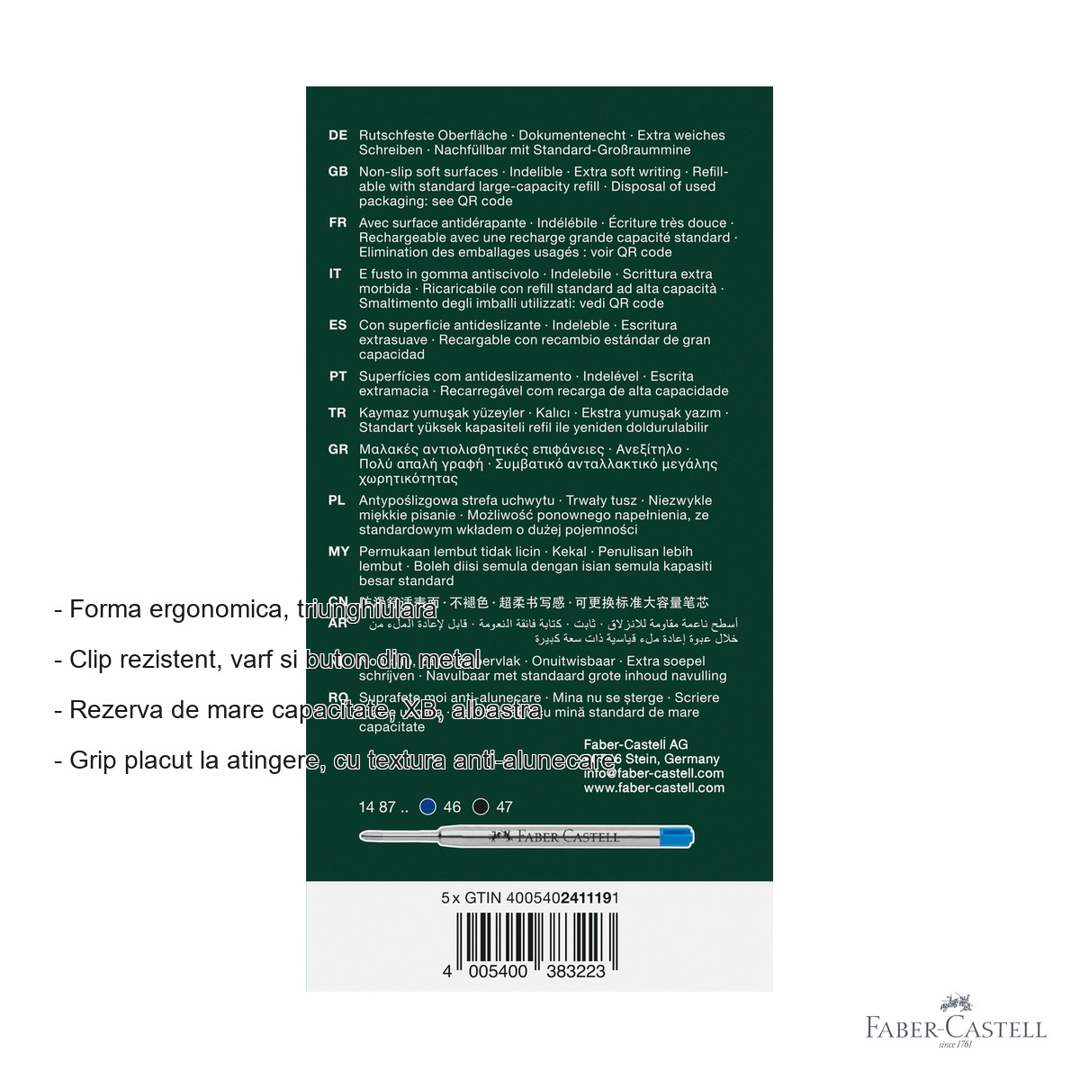 Pixul Faber-Castell Poly Ball XB Urban 2025 bordeaux combina functionalitatea cu estetica. Forma triunghiulara ergonomica reduce oboseala mainii in timpul sesiunilor lungi de scriere, fiind potrivita atat pentru dreptaci cat si pentru stangaci. Grip-ul cu textura anti-alunecare asigura un control precis al instrumentului, indiferent de conditii. Varful si butonul din metal confera un aspect premium si o durabilitate ridicata, prevenind uzura prematura a componentelor. Rezerva XB de mare capacitate inseamna mai putine intreruperi pentru inlocuire, iar cerneala albastra ofera un scris clar si lizibil pe orice tip de hartie. Mecanismul de retractare rapida protejeaza varful atunci cand pixul nu este folosit, evitand patarea hainelor sau a suprafetelor. Colectia Urban 2025 aduce culori noi, proaspete, care reflecta un stil modern si rafinat.