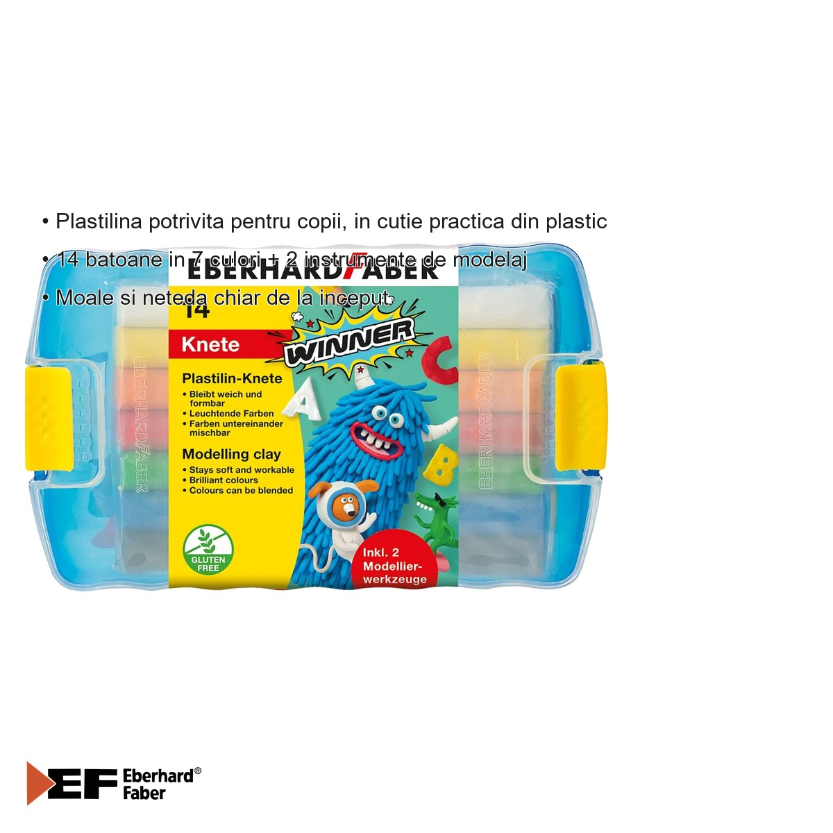 Unul dintre cele mai apreciate avantaje ale plastilinei Eberhard Faber este textura sa superioara: moale si neteda inca din momentul deschiderii cutiei, ceea ce o face accesibila chiar si celor mai mici copii. Nu necesita efort suplimentar pentru a o face maleabila, ceea ce inseamna ca micutii pot trece direct la creatie fara frustrari. Cele 7 culori vibrante acopera spectrul de baza si pot fi amestecate pentru a obtine nuante noi, transformand fiecare sesiune de joaca intr-o lectie practica de arta si culoare. Cele 2 instrumente de modelaj incluse in set permit realizarea de detalii fine si forme complexe, ridicand nivelul creatiilor la un nou standard. Cutia din plastic este robusta, usor de inchis si redeschis, pastrand plastilina proaspata si ferita de praf intre utilizari. Brandul Eberhard Faber este sinonim cu calitatea in domeniul rechizitelor creative, oferind parintilor si educatorilor incredere in siguranta si durabilitatea produsului.