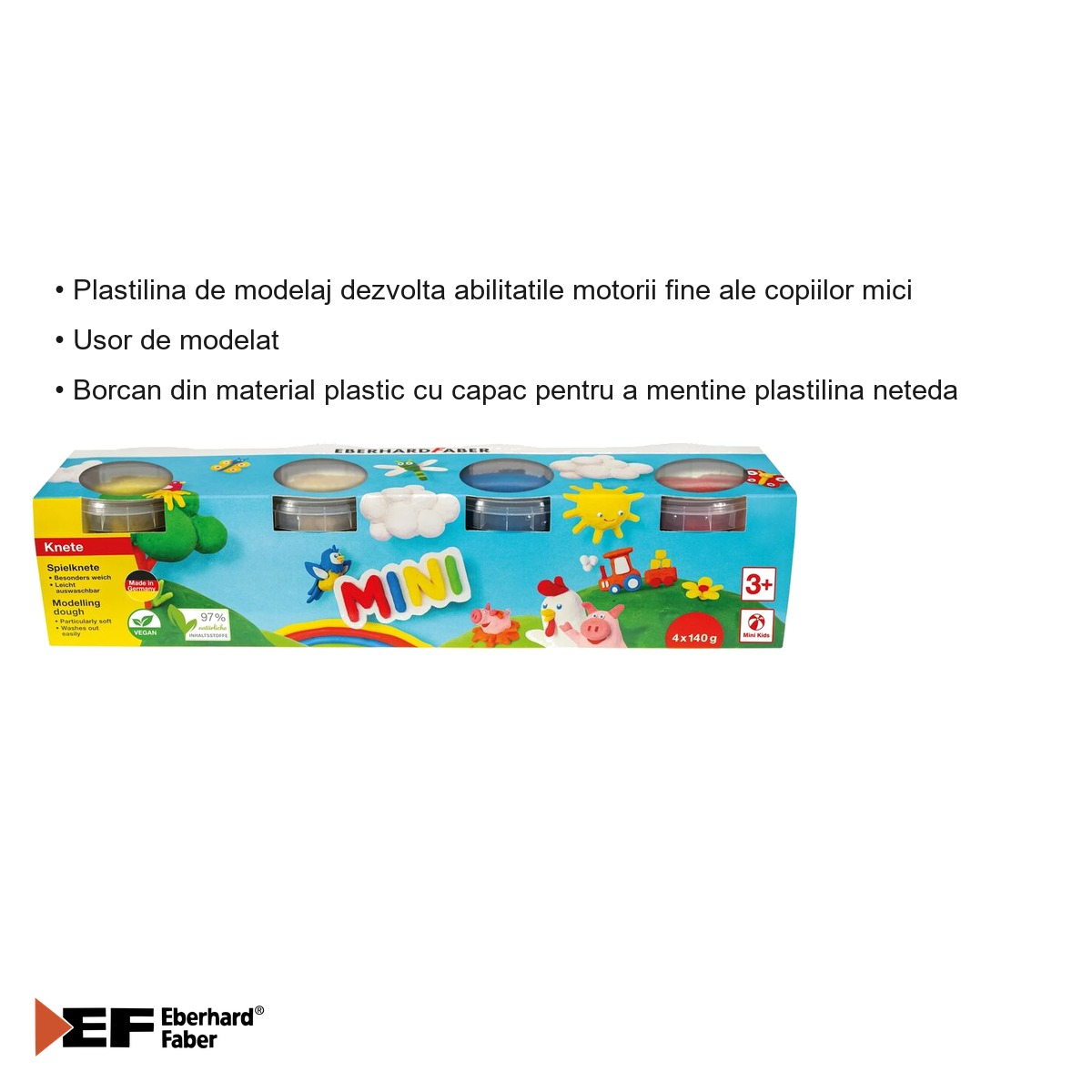 Setul de plastilina Eberhard Faber Basic vine cu o serie de avantaje care il fac sa se diferentieze de produsele similare de pe piata. In primul rand, fiecare culoare este pastrata intr-un borcan individual din material plastic de calitate, prevazut cu un capac etans care mentine plastilina moale si neteda pe toata perioada de utilizare, prevenind uscarea acesteia intre sesiunile de joaca. Acest sistem de ambalare individuala asigura si o organizare mai buna, culorile nefiind amestecate accidental.